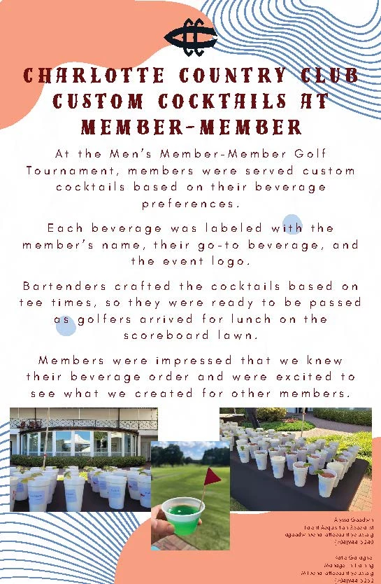 At the Men’s Member-Member Golf Tournament, members were served custom cocktails based on their beverage preferences. Each beverage was labeled with the member’s name, their go-to beverage, and the event logo.
