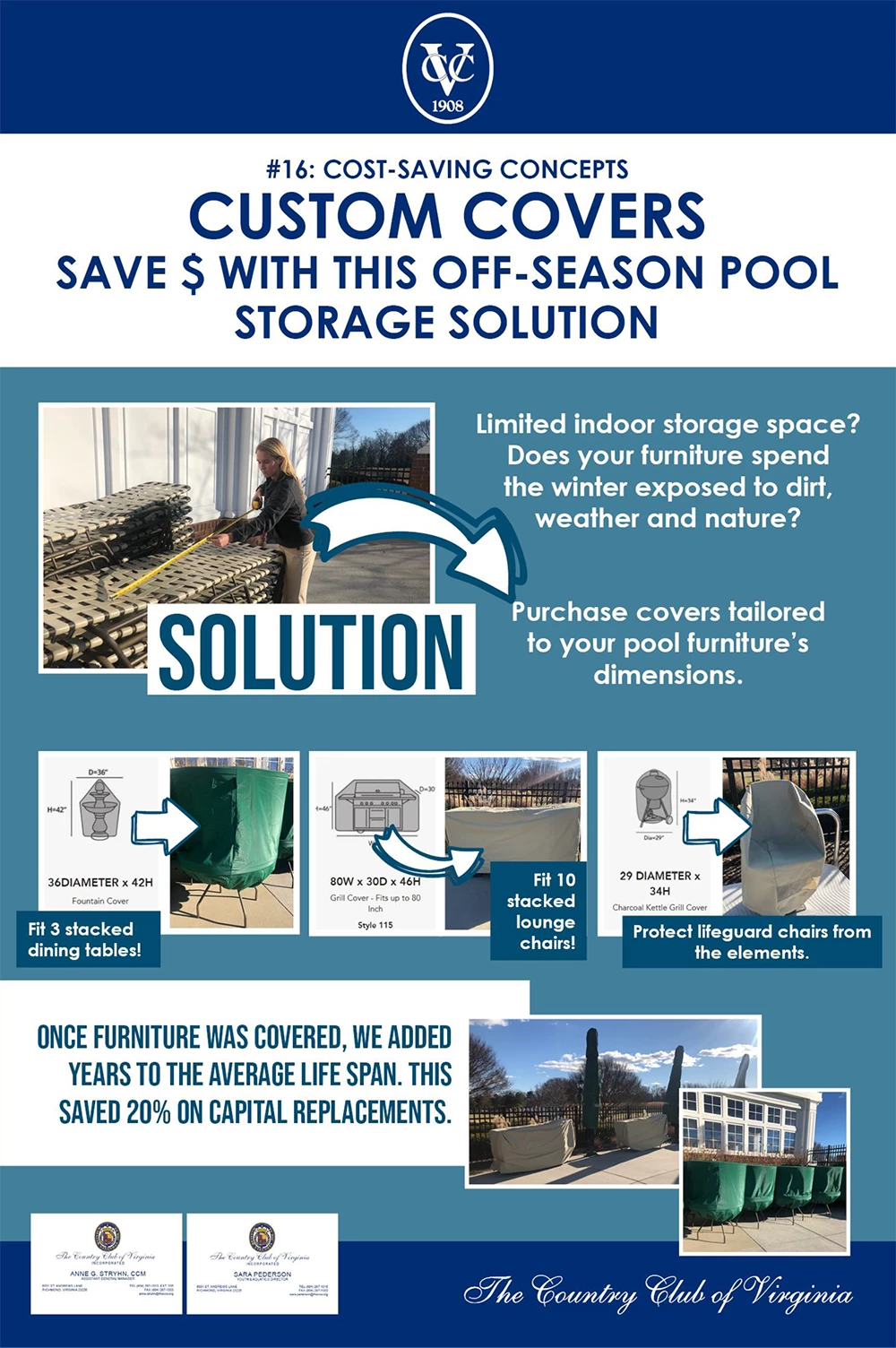 With limited storage space, our pool furniture tended to spend the winter exposed to dirt, weather, and nature – limiting its longevity and needing repairs. At The Country Club of Virginia, we decided to purchase covers designed for other items to fit our pool furniture by measuring and using a little creativity. For example, a fountain cover fits three stacked dining tables and a grill cover can fit ten stacked lounge chairs.