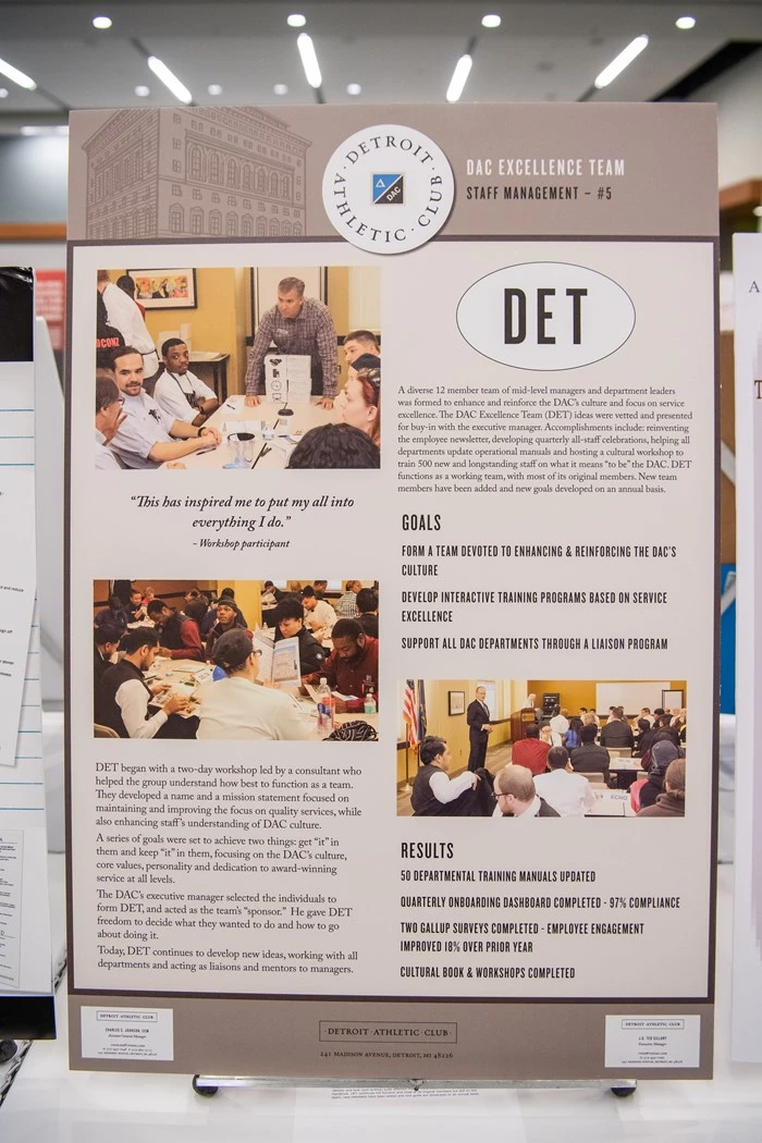 The beauty of DET is that is evolved from the group of leaders with a wide range of professional experience and was thus more grass roots than if it was just directed from top down from the executive manager. While the EM selected the individuals to come together at the beginning, and acted as the team’s “sponsor” he then allowed the group complete freedom to decide what they wanted to do and how they were going to go about doing it. What makes DET unique is that the group develops ideas, works with all the DAC’s various departments and acts as liaisons and mentors to other managers. DET ideas are vetted and then presented to the executive manager for potential buy-in. Some of the accomplishments for the group include: reinventing the employee newsletter, developing quarterly all-staff celebrations, helping all departments to refine and update operational manual already in existence, hosting a series of cultural workshop to train over 400 employees on what it means “to be” the DAC. These 90-minute workshops, utilizing interactive exercises as well as lecture form, were developed from an extensive new employee “brand” guide, or handbook, called “Everything Is: Being the Detroit Athletic Club.” This book used employee ideas and images of the staff to help explain complex ideas and systems for achieving and maintaining the highest standards of excellence, while also being very approachable and easy to follow through a unique identity and look (and writing) quite different than a more traditional employee handbook. DET continues the function and most of its original members are still on the team; new members have been added and new goals are developed on an annual basis.