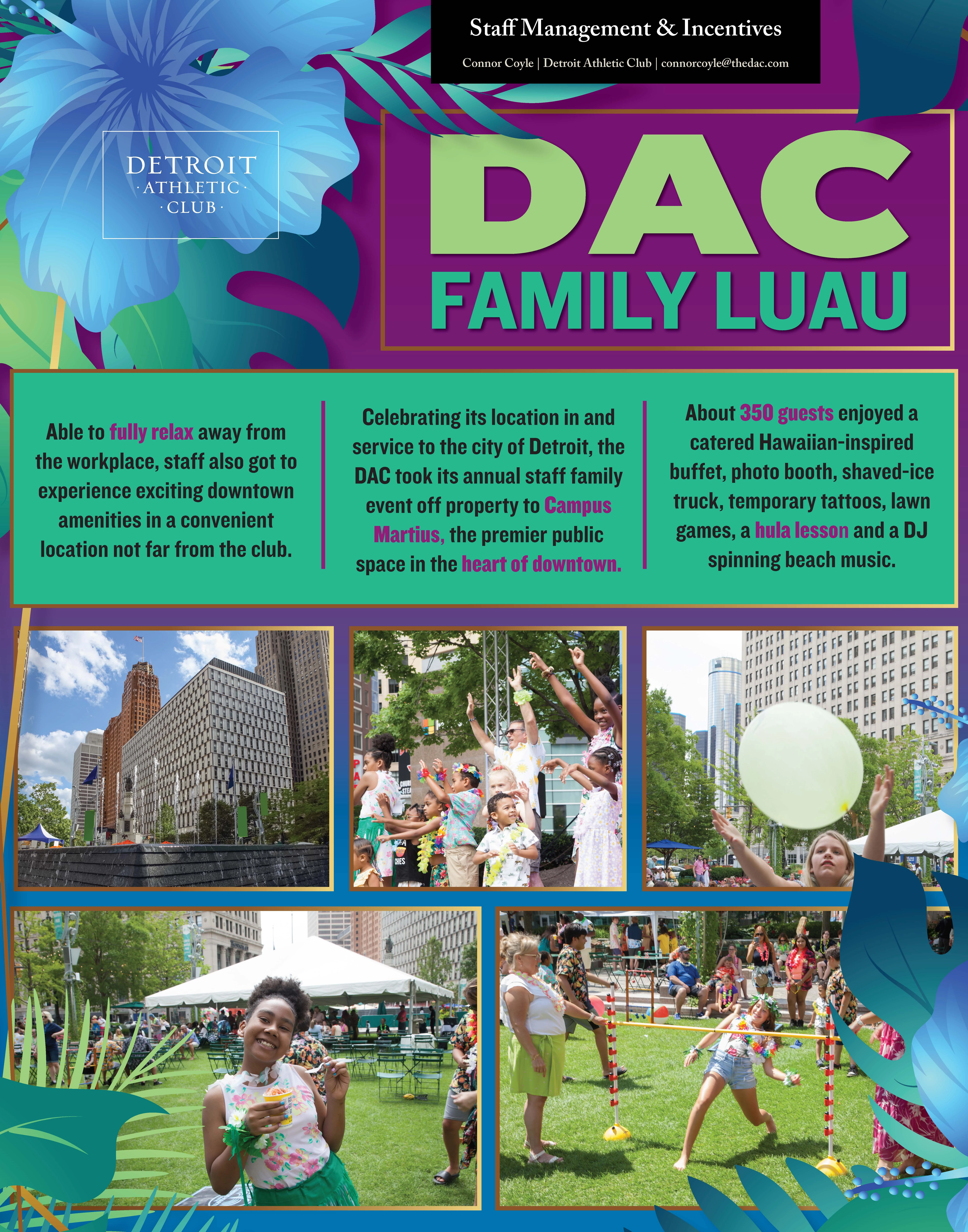Each summer, the Detroit Athletic Club hosts an employee appreciation event, encouraging staff to bring their families to connect through food and entertainment as well as win prizes. The event enhances staff morale and the collective pride in our workplace.