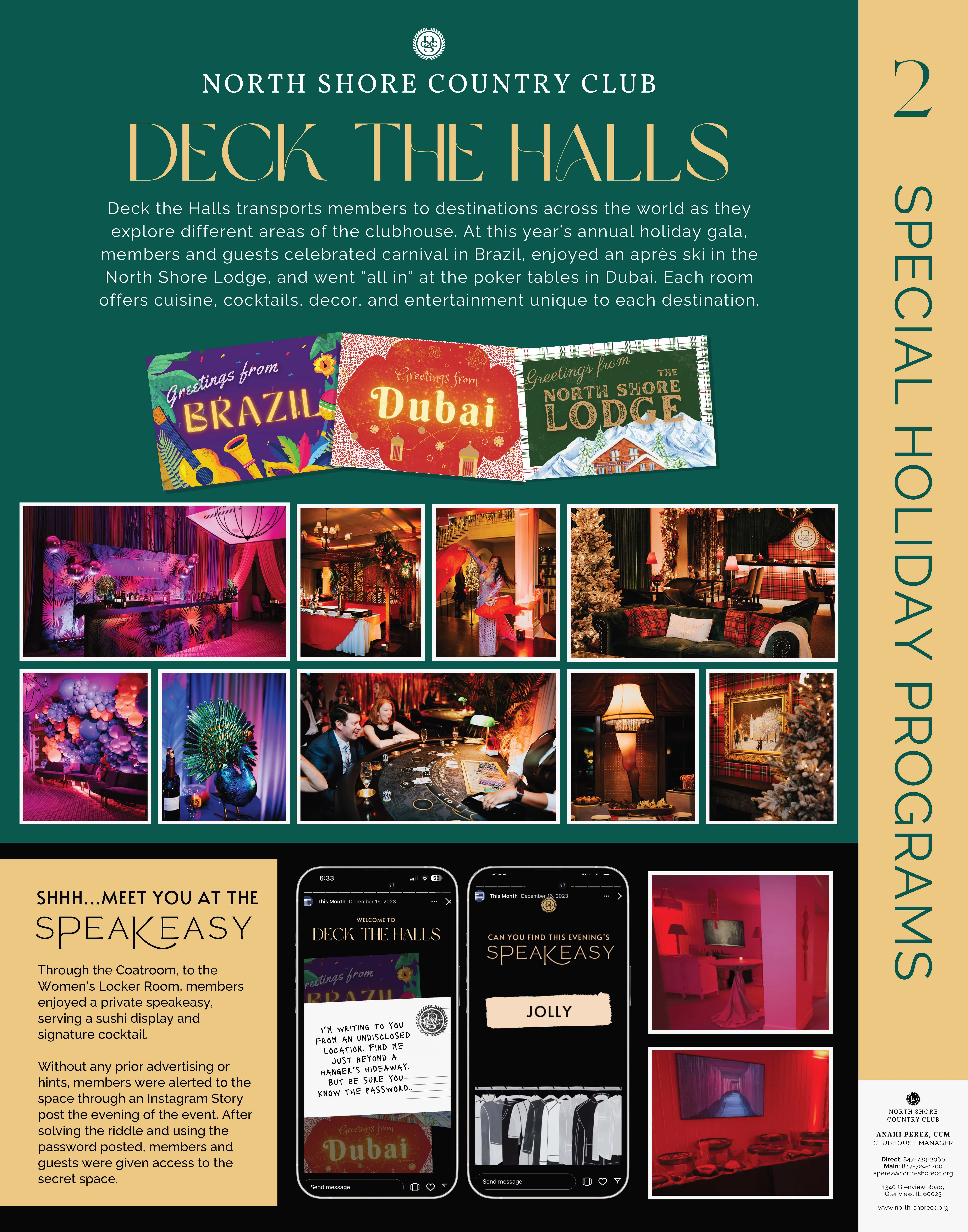 Deck the Halls transports members to destinations across the world as they explore different areas of the clubhouse. At this year’s annual holiday gala, members and guests celebrated carnival in Brazil, enjoyed an après ski in the North Shore Lodge, and went “all in” at the poker tables in Dubai. Each room offers cuisine, cocktails, decor, and entertainment unique to each destination. In addition, this past year saw the addition of a secret Speakeasy for members to enjoy. Through the Coatroom, to the Women’s Locker Room, members enjoyed a private speakeasy, serving a sushi display and signature cocktail. Without any prior advertising or hints, members were alerted to the space through an Instagram Story post the evening of the event. After solving the riddle and using the password posted, members and guests were given access to the secret space.