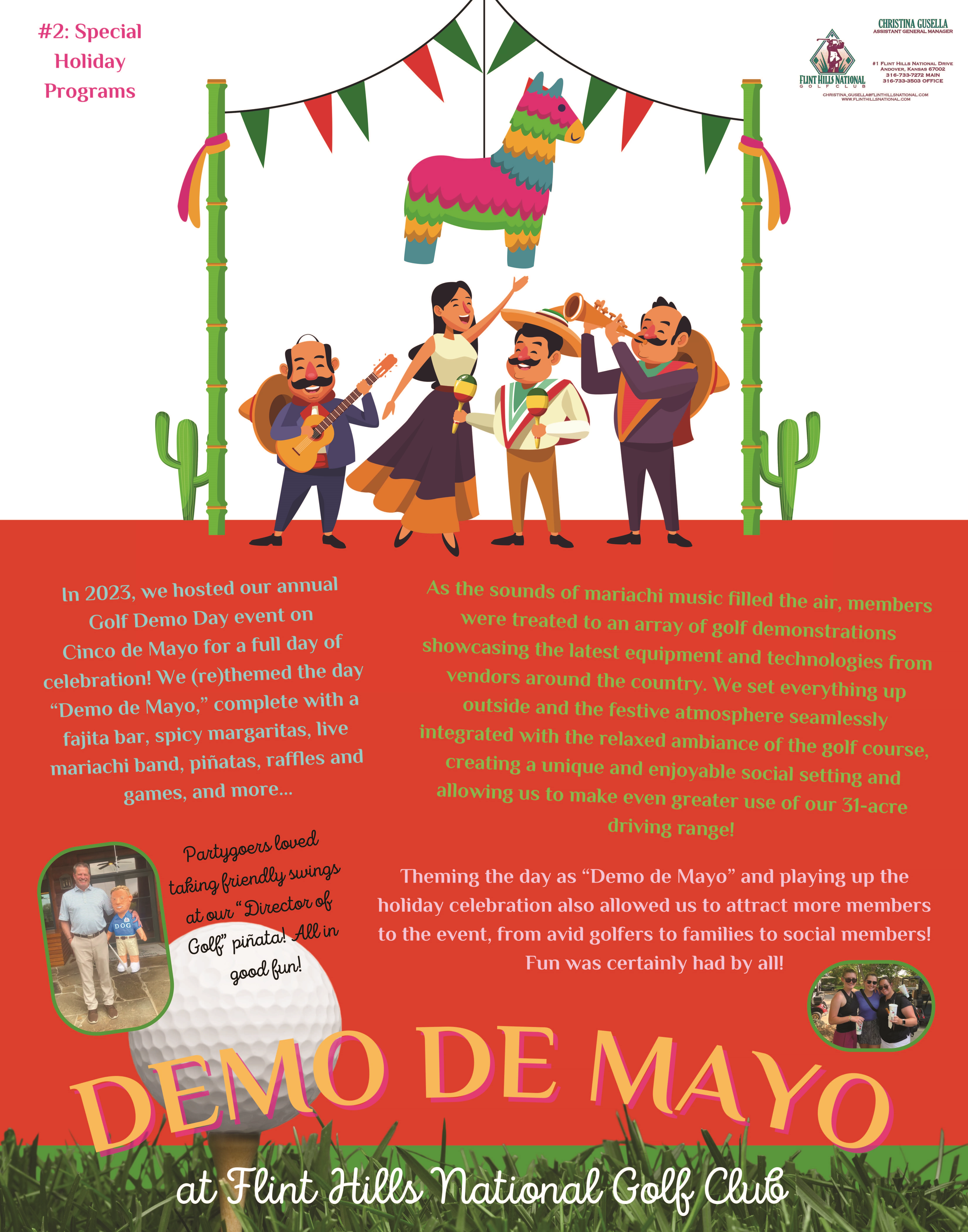The strategic combination of a Cinco de Mayo celebration with a Golf Demo Day proved to be a great success, not only in fostering a lively social atmosphere but also in highlighting our golf facilities and services and driving business for the vendors that came to showcase with us. The "Demo de Mayo" theming attracted a diverse range of members and strengthened their engagement with this annual event (Demo Day). The festive ambiance encouraged camaraderie, fostering a sense of community among all of our members and staff, and provided a unique and fun holiday event for all in attendance.