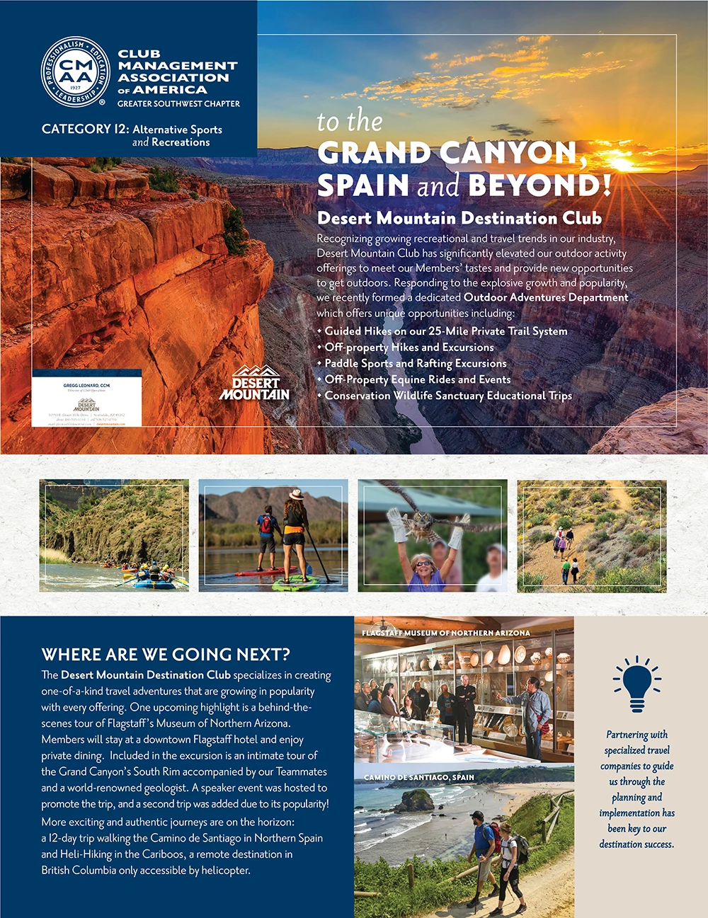 The expansion of the Outdoor Adventures team’s offerings to promote destination travel was implemented through additional Destination Club branding, marketing materials, features on Desert Mountain’s Podcast and placement on the club’s internal website. The number of hikers has climbed five-fold in two years and the number of off-property hikes and adventures have witnessed exponential growth, with full participation by Members.