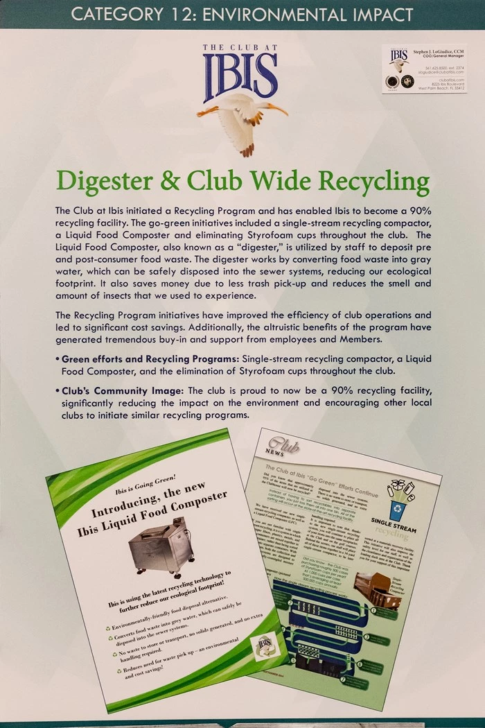 The Club at Ibis initiated a Recycling Program and has enabled Ibis to become a 90% recycling facility. The go-green initiatives included a single-stream recycling compactor, a Liquid Food Composter and eliminating Styrofoam cups throughout the club. The Liquid Food Composter, also known as a “digester,” is utilized by staff to deposit pre and post-consumer food waste. The digester works by converting food waste into gray water, which can be safely disposed into the sewer systems, reducing our ecological footprint. It also saves money due to less trash pick-up and reduces the smell and amount of insects that we used to experience.