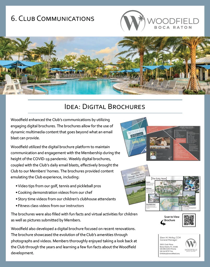 Woodfield utilized the digital brochure platform to maintain communication and engagement with the Membership during the height of the COVID-19 pandemic. Weekly digital brochures, coupled with the Club’s daily email blasts, effectively brought the Club to our Members’ homes. The brochures provided content emulating the Club experience, including: