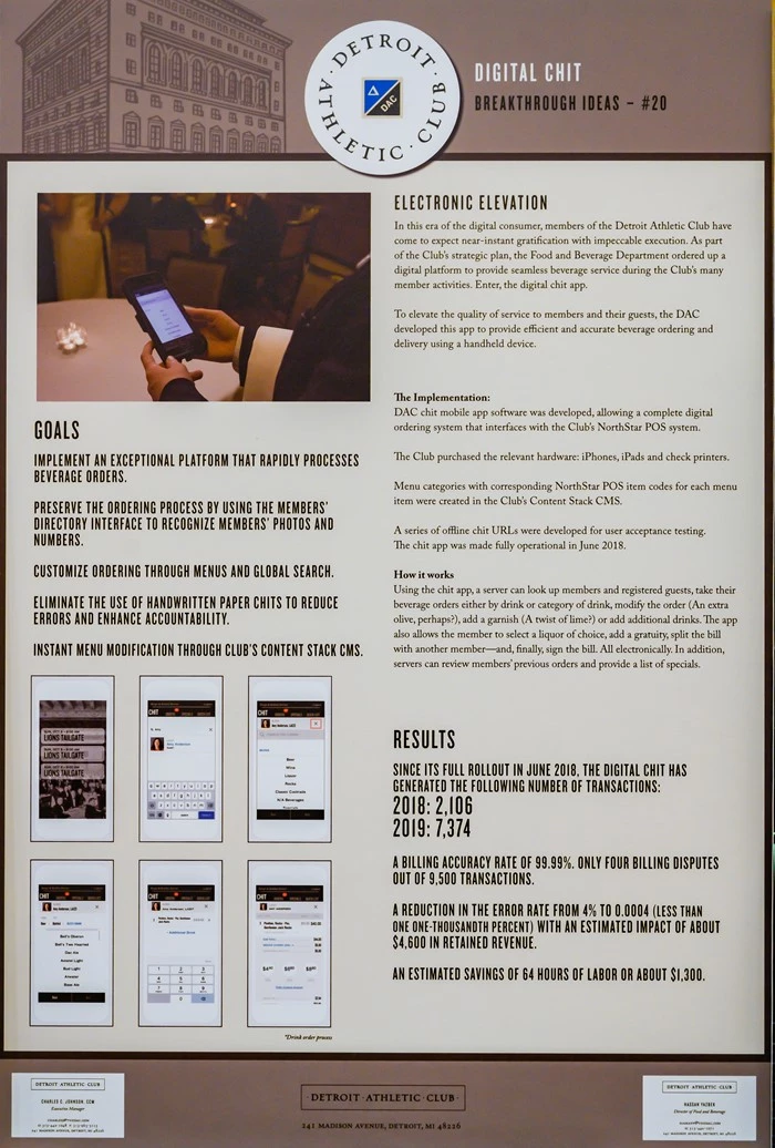 In this era of the digital consumer, members of the Detroit Athletic Club have come to expect near-instant gratification with impeccable execution. As part of the Club’s strategic plan, the Food and Beverage Department ordered up a digital platform to provide seamless beverage service during the Club’s many member activities. Enter, the digital chit app.