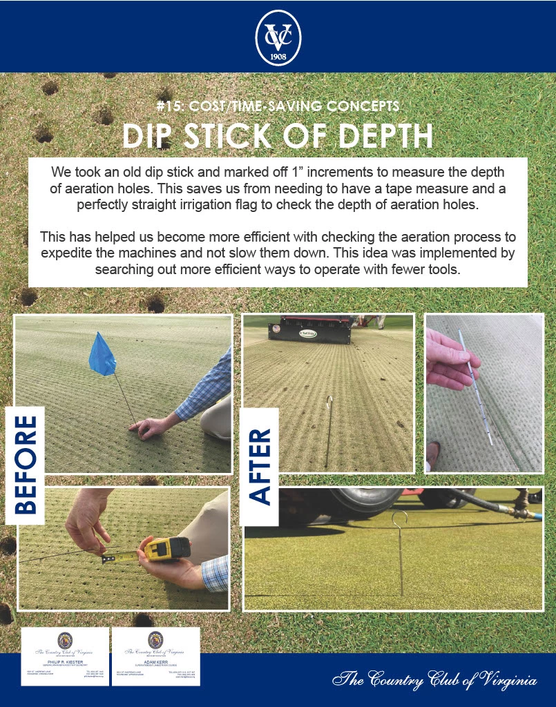 We took an old dip stick and marked off 1” increments to measure the depth of aeration holes. This saves us from needing to have a tape measure and a perfectly straight irrigation flag to check the depth of aeration holes. This has helped us become more efficient with checking the aeration process to expedite the machines and not slow them down.