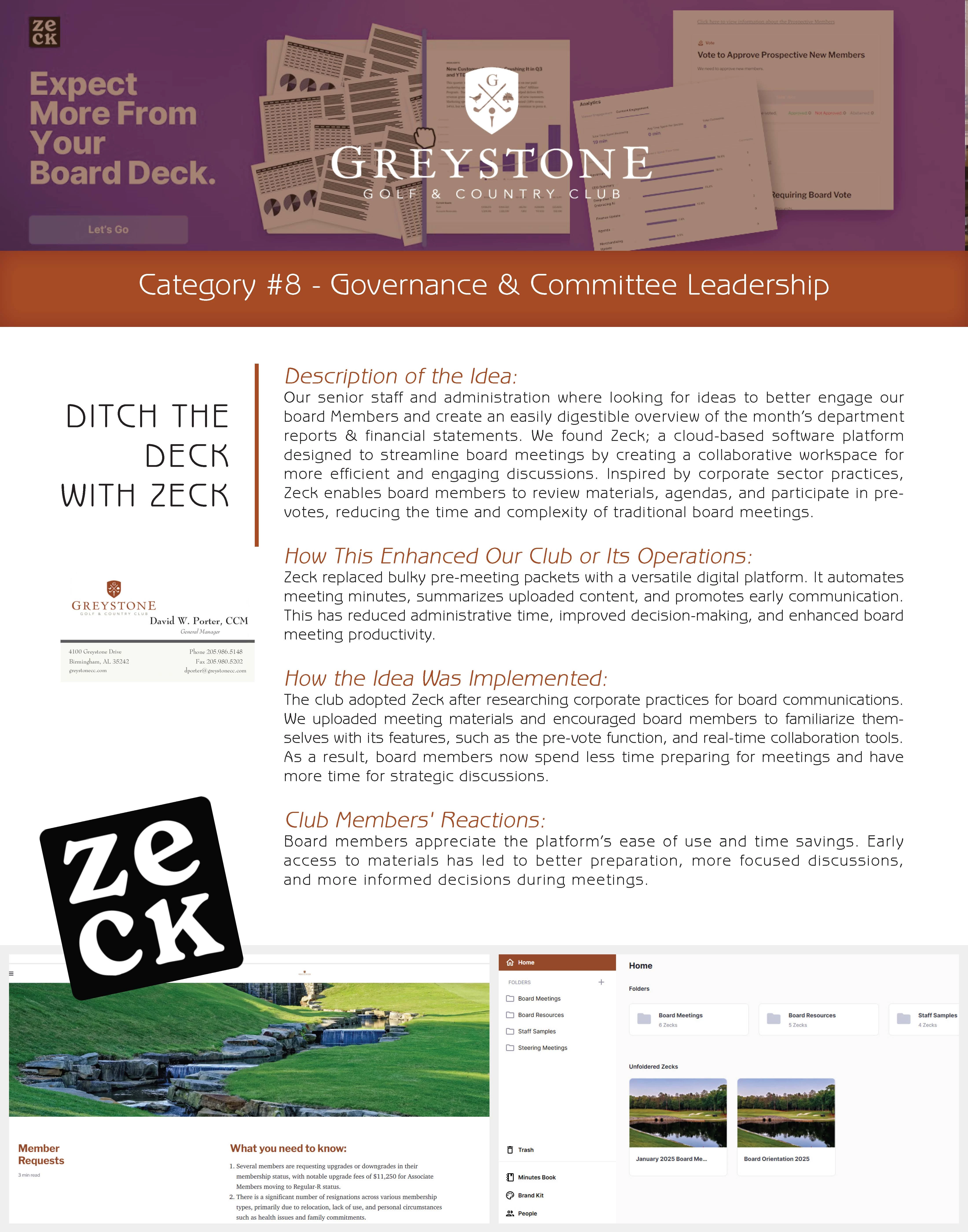 The club adopted Zeck after researching corporate practices for board communications. We uploaded meeting materials and encouraged board members to familiarize themselves with its features, such as the pre-vote function, and real-time collaboration tools. As a result, board members now spend less time preparing for meetings and have more time for strategic discussions. Board members appreciate the platform’s ease of use and time savings. Early access to materials has led to better preparation, more focused discussions, and more informed decisions during meetings.
