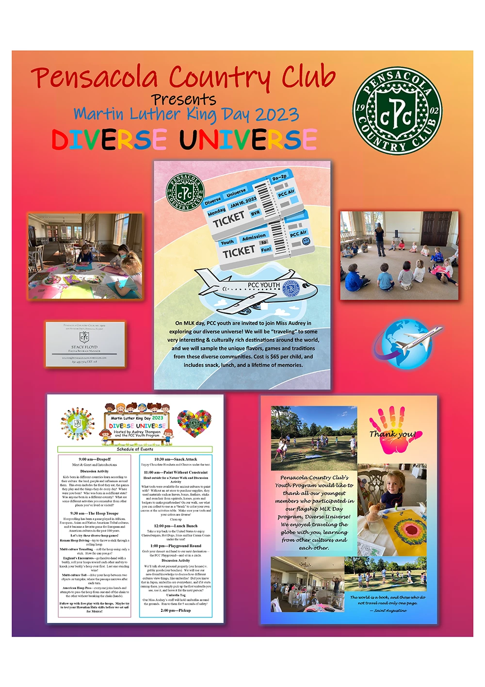 PCC's Diverse Universe is a youth program designed to enhance our little members' cultural awareness. Held on Martin Luther King Day, we shared our dream to foster the celebration of diversity and inclusion while encouraging our youth's creativity and passion for learning. This program was such a success that it created a surge in our members' desires for more new and creative youth activities away from the realms of pool, tennis and golf.