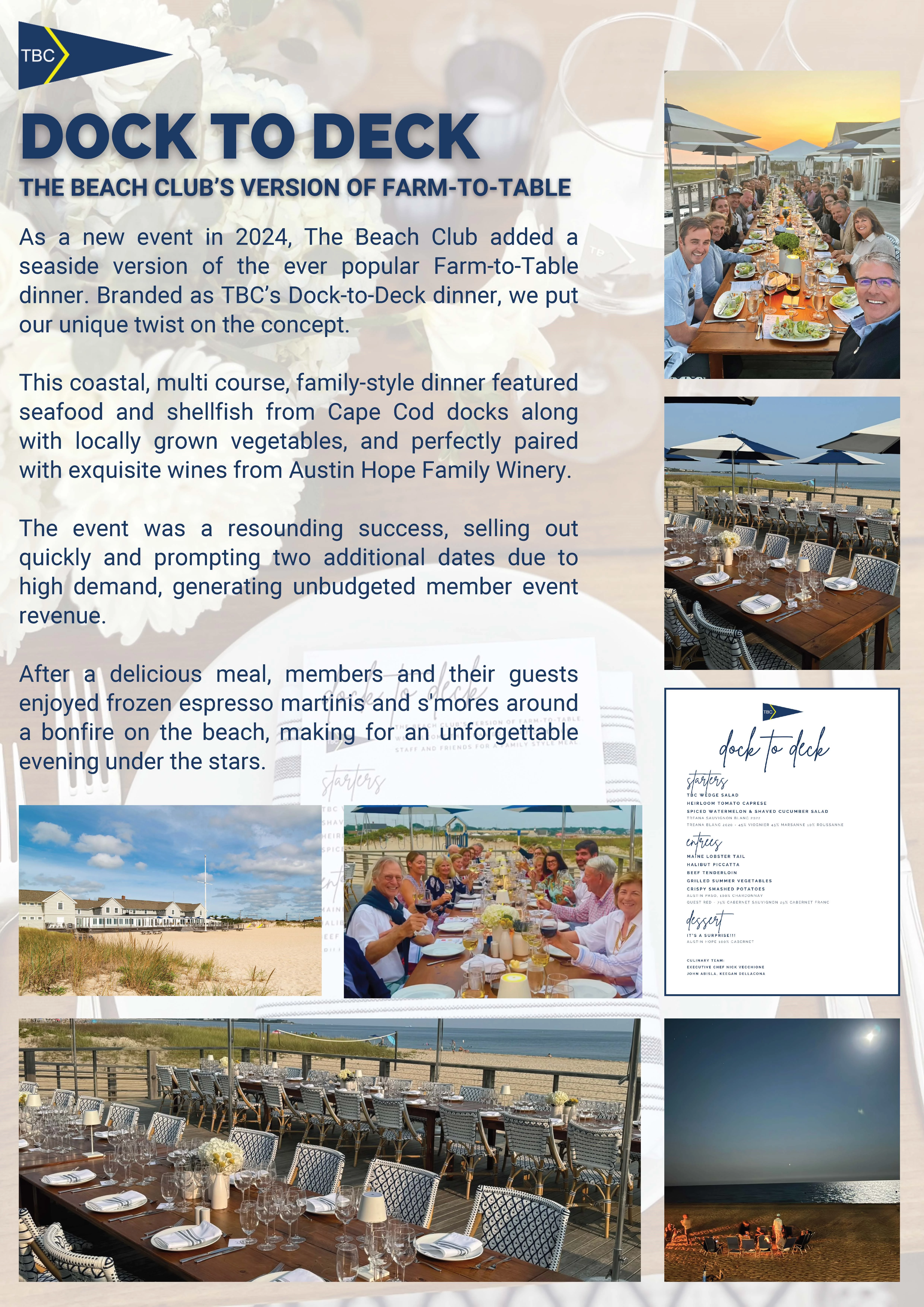 As a new event in 2024, The Beach Club added a seaside version of the ever popular Farm-to-Table dinner. Branded as TBC’s Dock-to-Deck dinner, we put our unique twist on the concept.