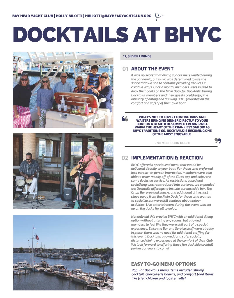 Not only did this provide BHYC with an additional dining option without altering any rooms, but allowed members to feel like they were still part of a special experience. Since the Bar and Service staff were already in place, there was no need for additional staffing for this event. Docktails allowed for a safe, socially distanced dining experience at the comfort of their Club. We look forward to offering these fun dockside cocktail parties for years to come!