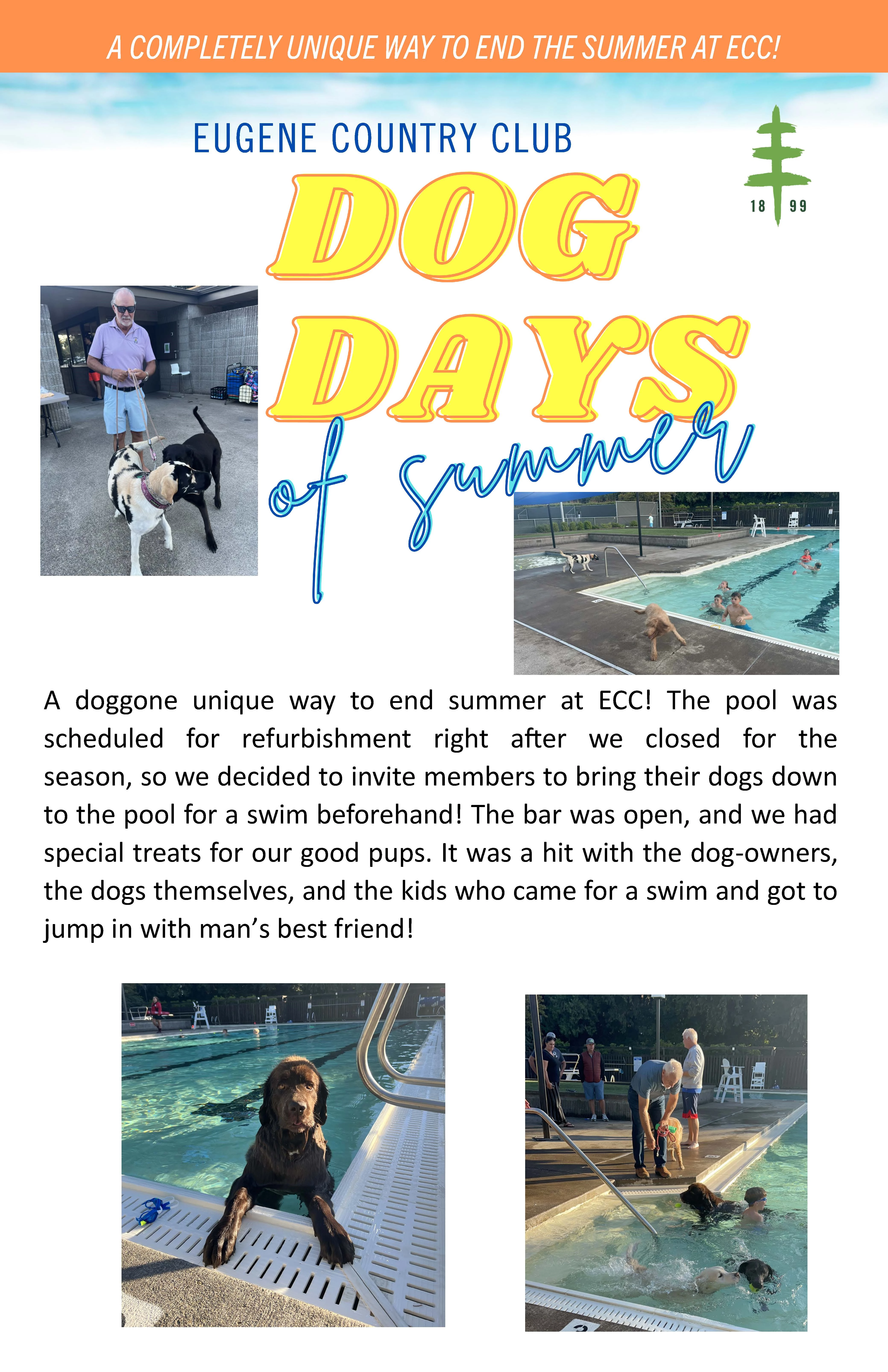 We wanted to do something fun for the end of summer and prior to refurbishing our pool so we invited members to bring their dogs to the pool for an afternoon/evening swim. We had the dogs and kids swimming in the pool. Dog treats, bar was open and music.