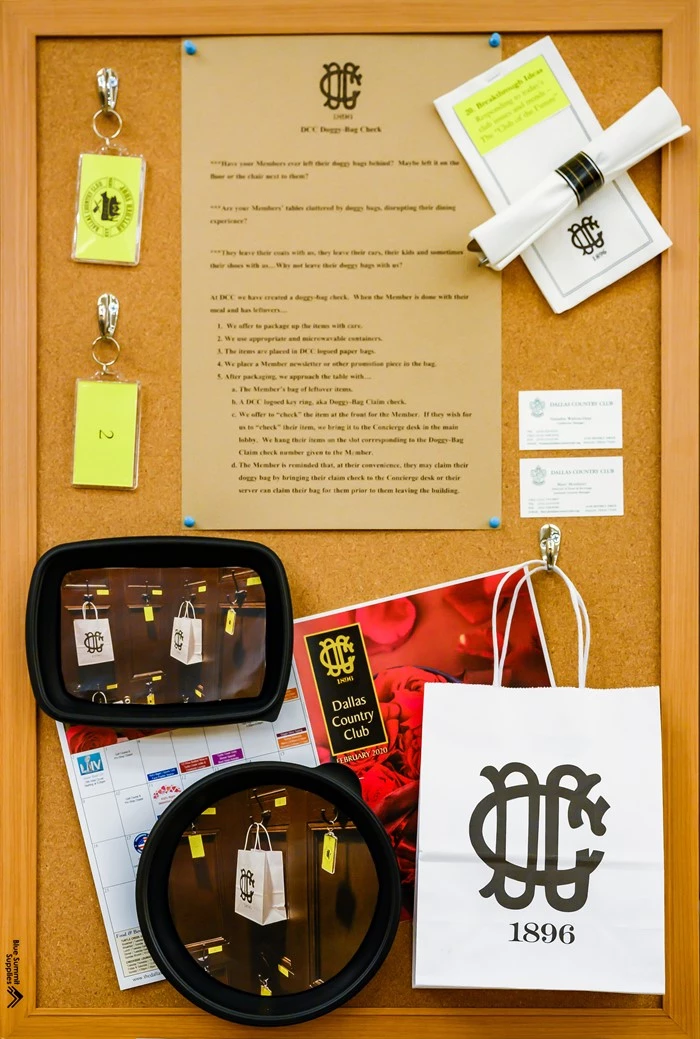 We have created the Doggy-bag coat check, a service where we temporarily store your doggy-bag until you as the Member are ready to leave the Club. We give you a Doggy-Bag claim check in exchange for your leftovers, storing them at the front desk on the hanger with the corresponding number to the tag.