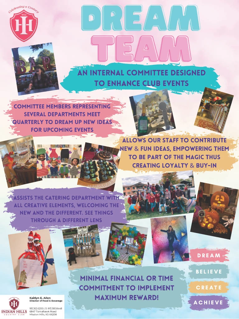 The Indian Hills Country Club “Dream Team” is an internal committee of staff members from various departments, and various experience levels who are creative and have an interest in enhancing the club’s event operations and provide member value. The purpose of this quarterly committee is to aid in the creative development and idea sharing when planning our many club events. The committee agenda will typically consist of an ice breaker to allow staff from various departments to get to know one another. Next we will discuss any upcoming events such as Kid’s Easter, Halloween, Centennial events, social events, etc. The committee is an open space to discuss any new fun idea or event element that will add value to the club or make something easier or more efficient. We are dreamers, and the time spent is well worth it, as frequently the most unique inspired ideas come from the most unlikely of team members. Years ago a busser came up with the idea for an Adult Easter Egg hunt. We gave it a shot and it turned out to be a huge success! This simultaneously enhances the operation and empowers our teammates, creating buy-in and loyalty. The best ideas we dream up are submitted to the Social Committee for final blessings and vetting.