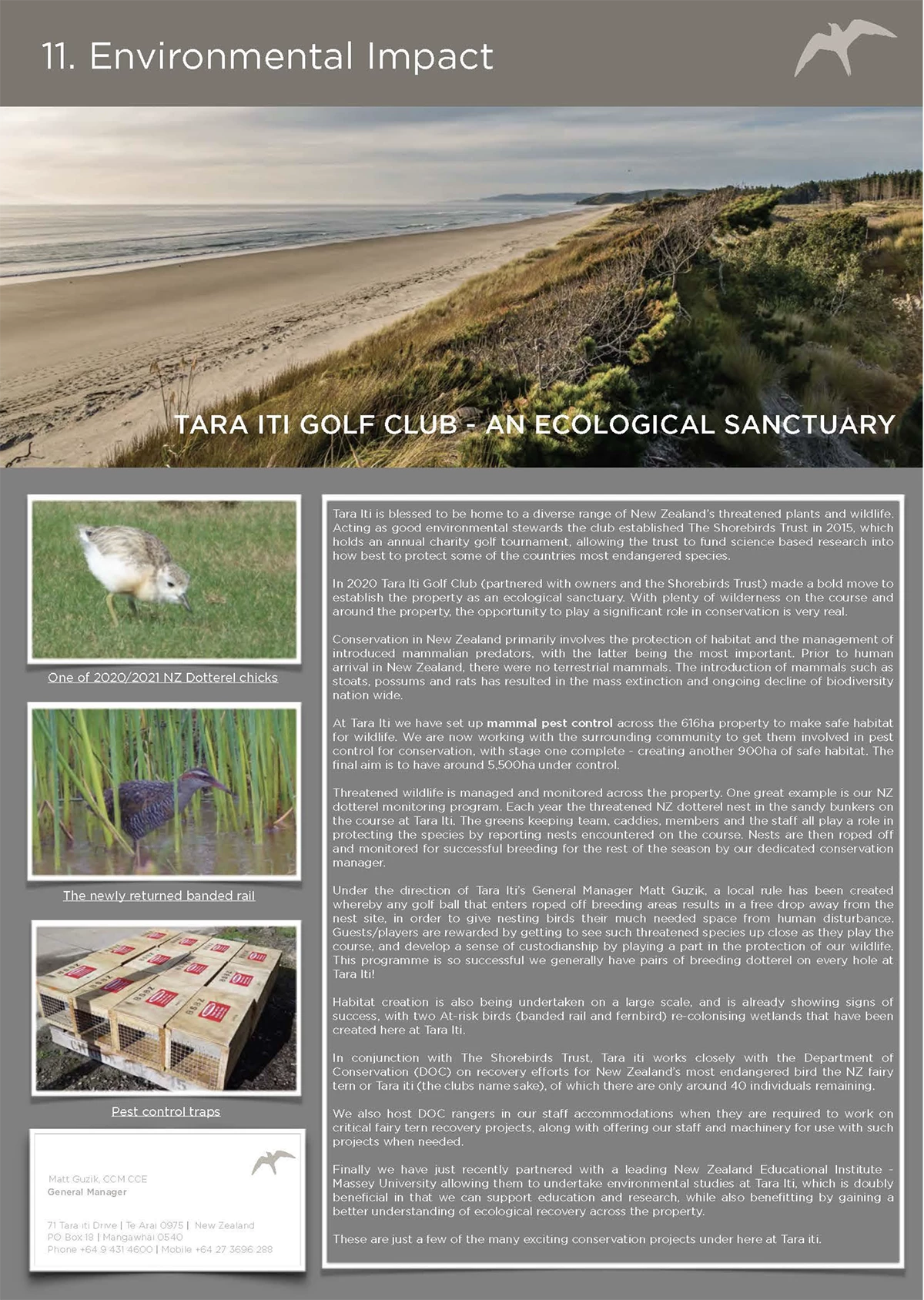 Threatened wildlife is managed and monitored across the property. One great example is our NZ dotterel monitoring program. Each year the threatened NZ dotterel nest in the sandy bunkers on the course at Tara Iti. The greens keeping team, caddies, members and the staff all play a role in protecting the species by reporting nests encountered on the course. Nests are then roped off and monitored for successful breeding for the rest of the season by our dedicated conservation manager.