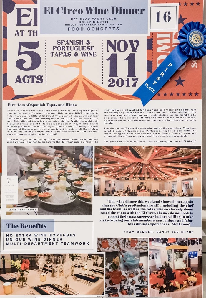 Every Club loves their cherished wine dinners. An elegant night of fine wines and off season revenue. This month, BHYC decided to ‘clown around’ a little at El Circo! This Spanish circus wine dinner featured wines the Club already had in stock from Spain and Portugal. This allowed for a low-cost wine dinner. While the night still featured a wine expert to talk about the selections, members were able to purchase the bottles right from the Club. Coming towards the end of the season, it was great to get inventory off the shelves and let the members experience some new wines on our list that they otherwise might not have tried!