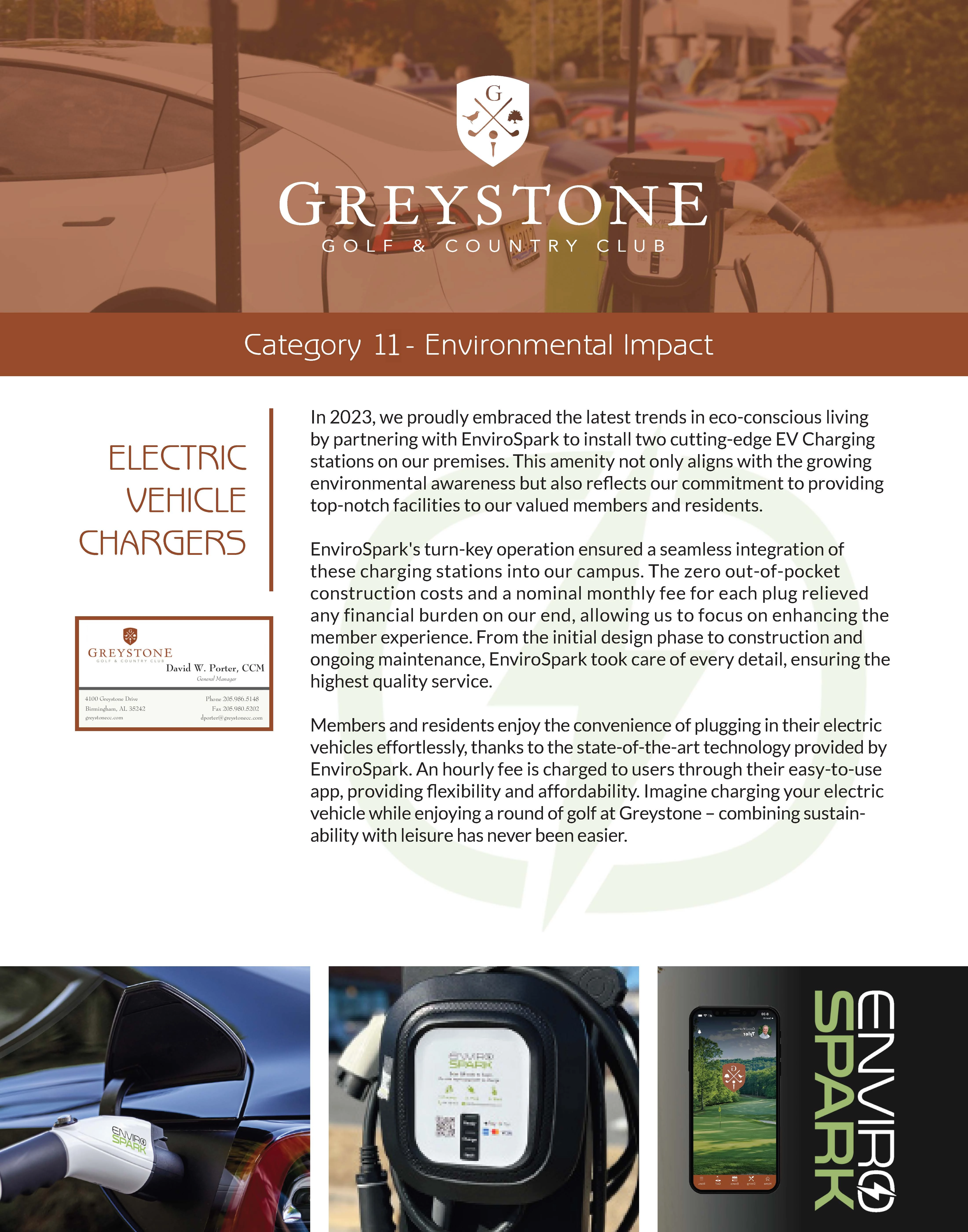 Greystone embraced the latest trends in eco-conscious living by partnering with EnviroSpark to install two EV Charging stations on our premises. This amenity aligns with the growing environmental awareness and reflects our commitment to providing top-notch facilities to our valued members and residents.