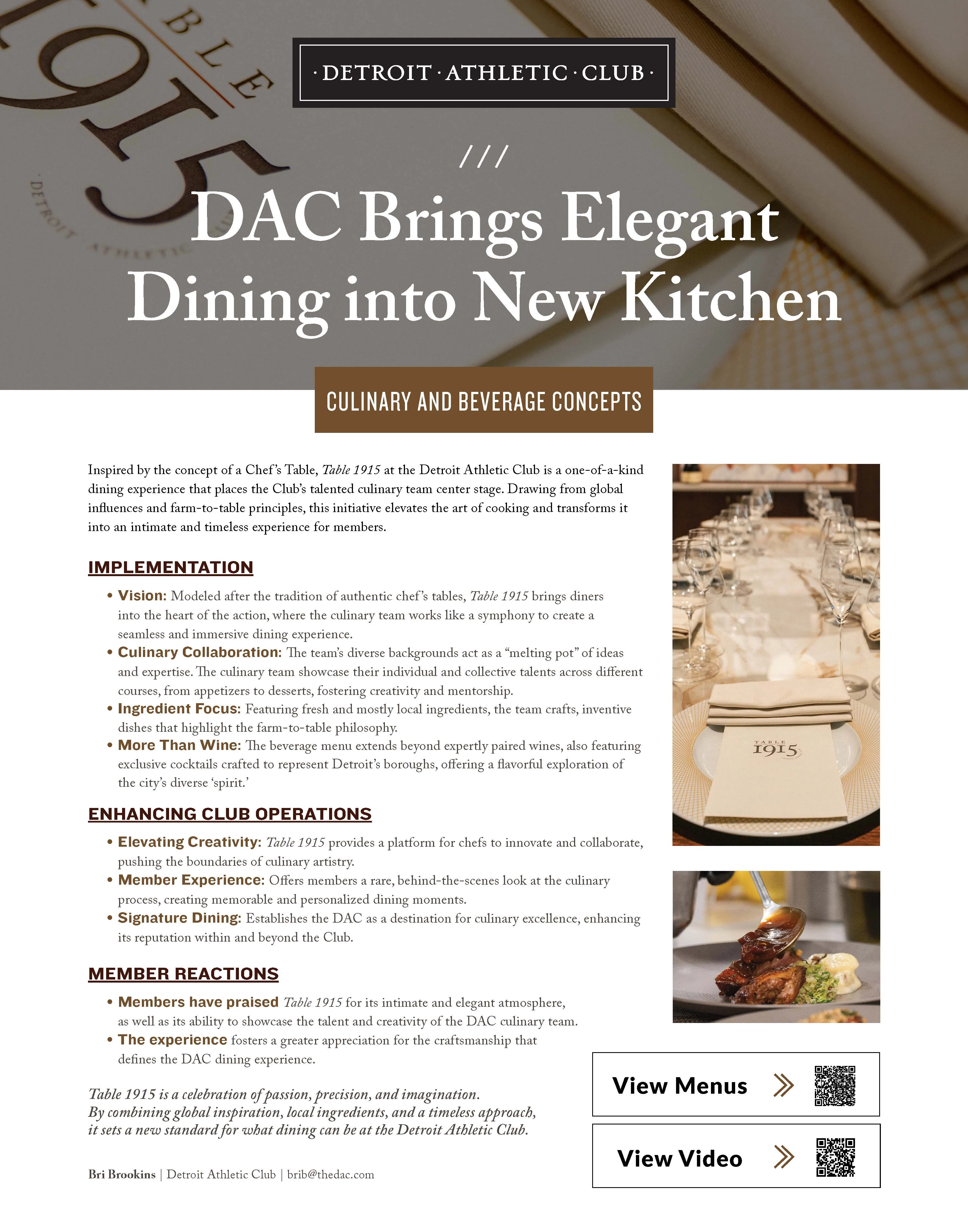 Inspired by the concept of a Chef’s Table, Table 1915 at the Detroit Athletic Club is a one-of-a-kind dining experience that places the Club’s talented culinary team center stage. Drawing from global influences and farm-to-table principles, this initiative elevates the art of cooking and transforms it into an intimate and timeless experience for members.