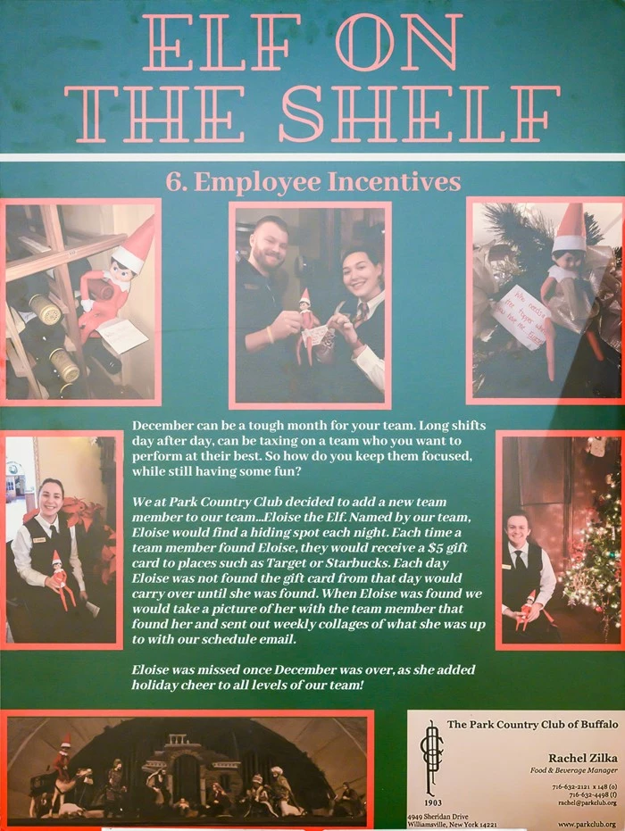 We thought of the idea toward the end of November when we started to see people posting their own Elf on the Shelfs on Social Media. We purchased an elf along with twenty-five $5 gift cards to places like Target, Starbucks and Wegmans. These were to be the rewards for the person who found the elf each day. If the elf wasn't found on a day, the person who eventually found it, got the gift card for finding it along with the gift cards from the days it was not found. We rolled out the idea to the team and immediately asked for suggestions on what to name the elf, which we ultimately named Eloise. Once named, the idea was spoken about at pre-shift meetings and Eloise sent a cute "elfie" to the staff in the first December schedule email. Starting on December 1st, the closing manager hid Eloise each evening. Since the club was decorated for the holiday season at the time, there were PLENTY of fun places to put Eloise. Eloise traveled to wreaths in the hall, Christmas trees, our wine cabinet, our sound system unit where she was a DJ, and countless other spots. Every time someone found Eloise, we took a picture of them with the elf and sent out weekly collages to the team in the schedule email so that they could see who had found her and where that week. Our team loved it and enjoyed the gift cards as little holiday perks for themselves or to gift to others. Managers loved it as well; each one typically sending a picture each evening of where they hid it in hopes of out-doing previous hiding spots by others. This low cost employee morale booster was a hit during a month where we typically see our team get run down and lose enthusiasm. This brought a sense of fun to our clubhouse and team!