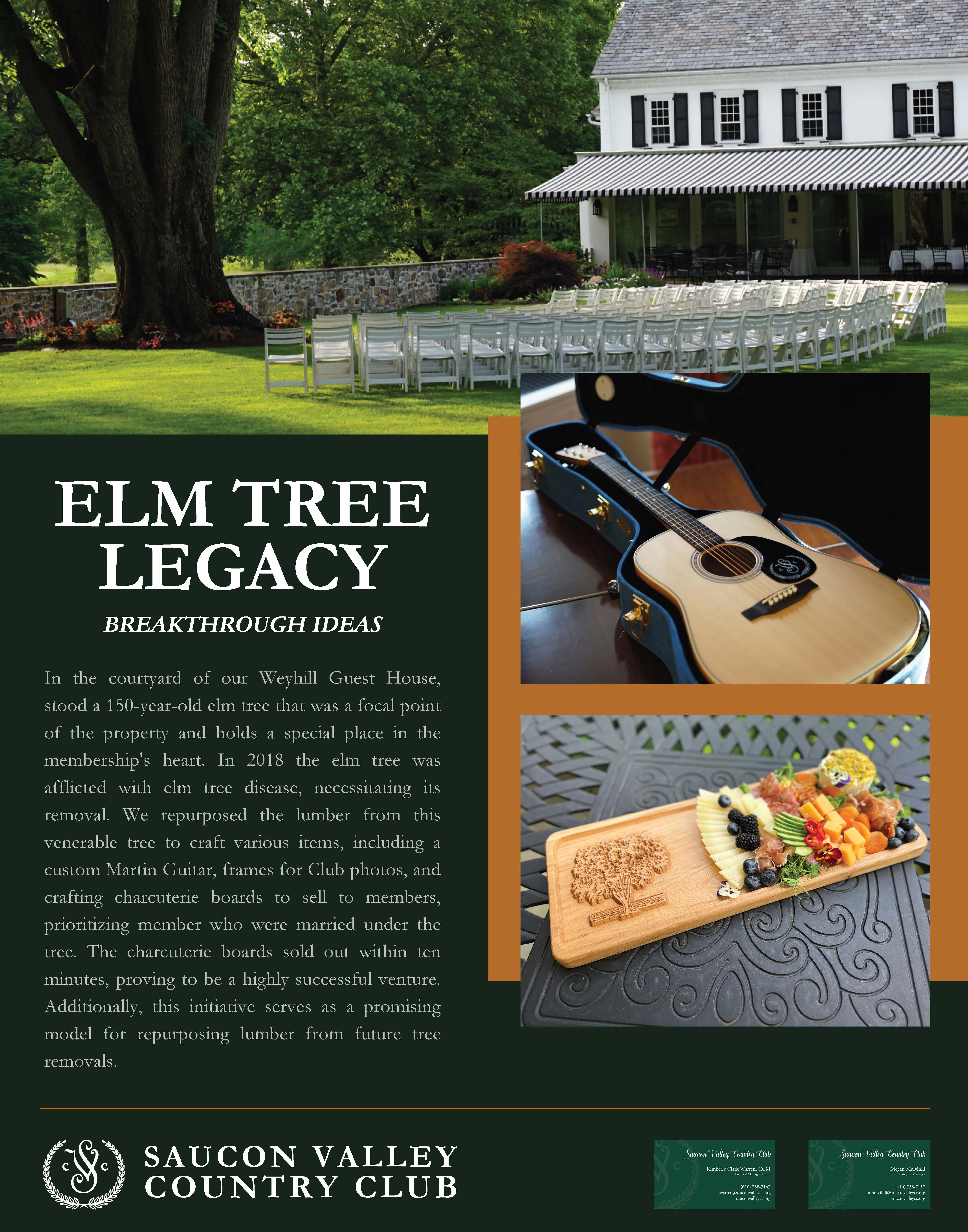 In the courtyard of our Weyhill Guest House, stood a 150-year-old elm tree that was a focal point of the property and holds a special place in the membership's heart. In 2018 the elm tree was afflicted with elm tree disease, necessitating its removal.We repurposed the lumber from this venerable tree to craft various items, including a custom Martin Guitar, frames for Club photos, and crafting charcuterie boards to sell to members, prioritizing member who were married under the tree.