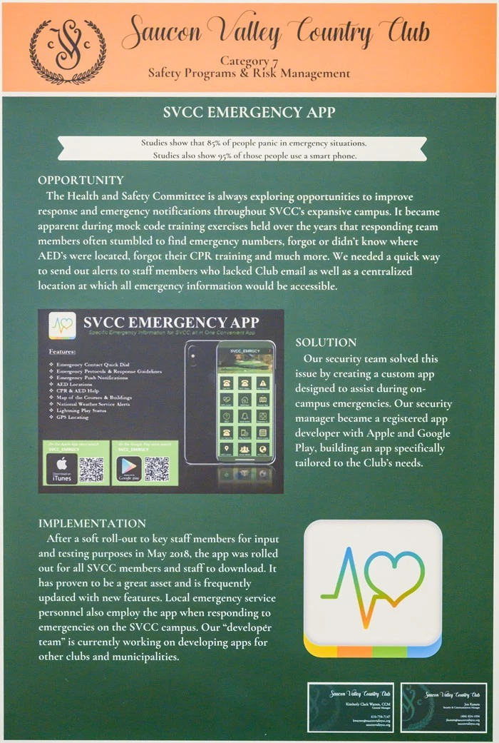 Our security team solved this issue by creating a custom app designed to assist during on-campus emergencies. Our security manager became a registered app developer with Apple and Google Play, building an app specifically tailored to the Club’s needs. After a soft roll-out to key staff members for input and testing purposes in May 2018, the app was rolled out for all SVCC members and staff to download. It has proven to be a great asset and is frequently updated with new features. Local emergency service personnel also employ the app when responding to emergencies on the SVCC campus. Our “developer team” is currently working on developing apps for other clubs and municipalities.