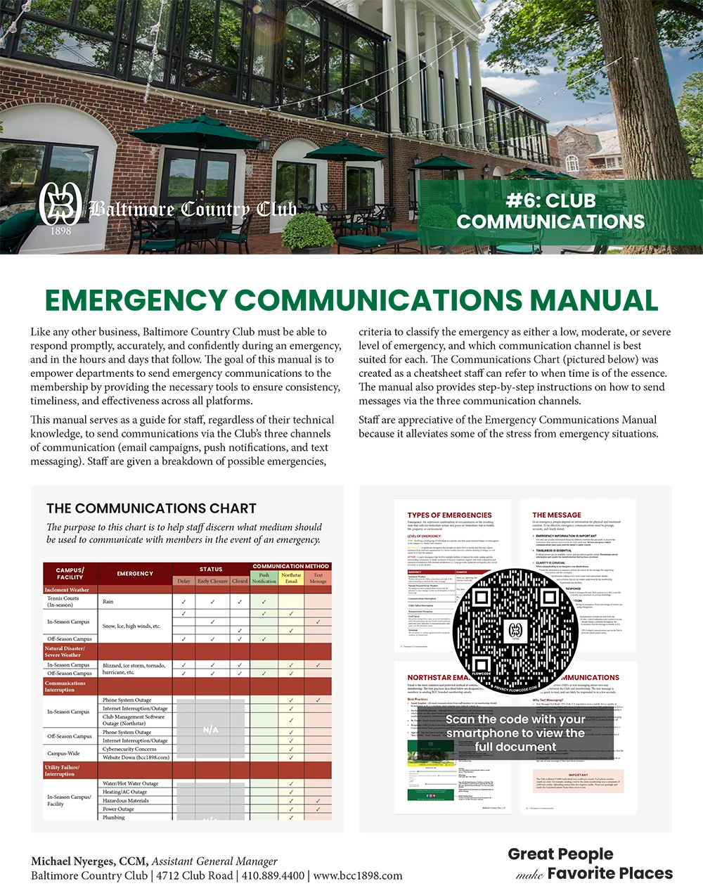 Like any other business, Baltimore Country Club must be able to respond promptly, accurately, and confidently during an emergency, and in the hours and days that follow. The goal of this manual is to empower departments to send emergency communications to the membership by providing the necessary tools to ensure consistency, timeliness, and effectiveness across all platforms.