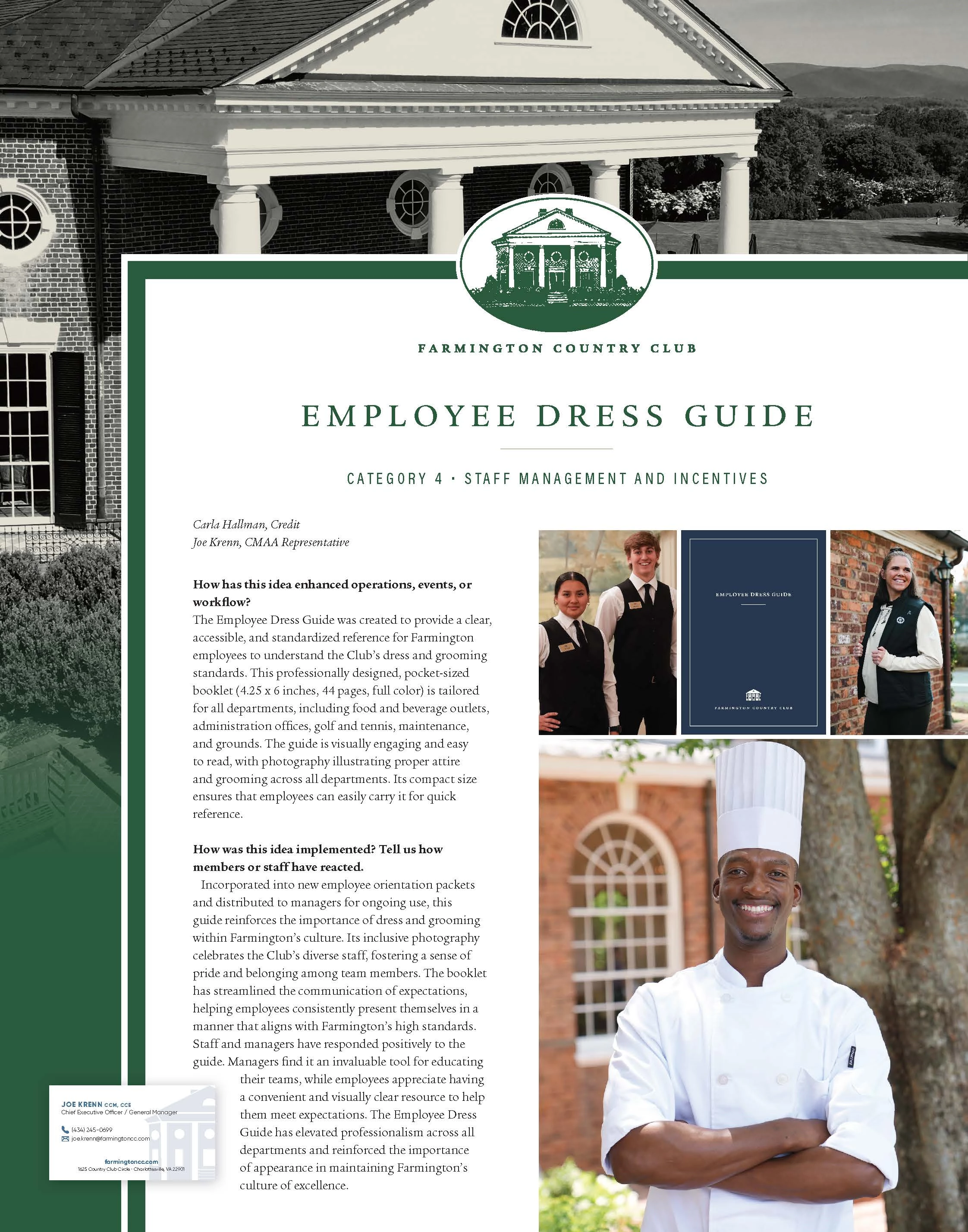 Incorporated into new employee orientation packets and distributed to managers for ongoing use, this guide reinforces the importance of dress and grooming within Farmington’s culture. Its inclusive photography celebrates the Club’s diverse staff, fostering a sense of pride and belonging among team members. The booklet has streamlined the communication of expectations, helping employees consistently present themselves in a manner that aligns with Farmington’s high standards. Staff and managers have responded positively to the guide. Managers find it an invaluable tool for educating their teams, while employees appreciate having a convenient and visually clear resource to help them meet expectations. The Employee Dress Guide has elevated professionalism across all departments and reinforced the importance of appearance in maintaining Farmington’s culture of excellence.