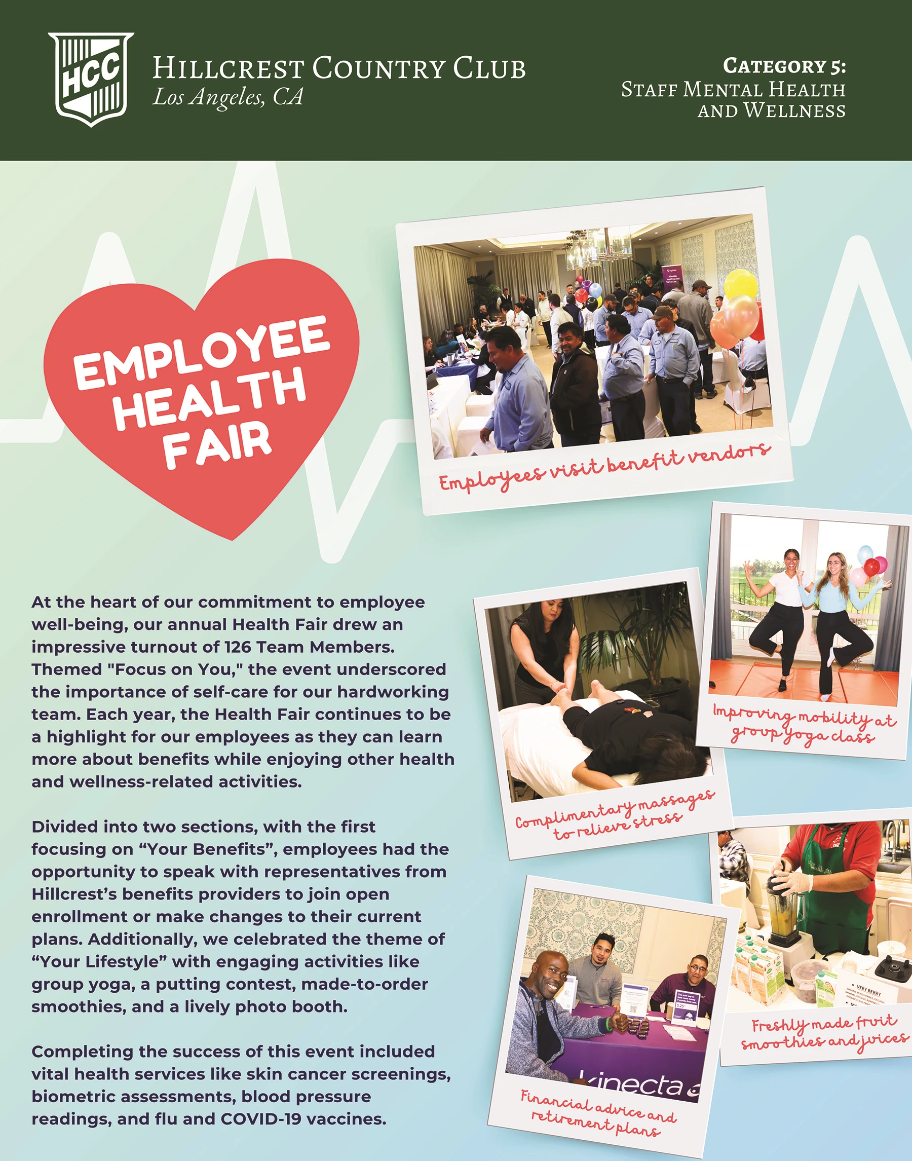 Each year we hold a "Health Fair" for our employees as we are firm believers in investing in our team members' overall well-being. At the heart of our commitment to employee well-being, our annual Health Fair drew an impressive turnout of 126 Team Members. Themed "Focus on You," the event underscored the importance of self-care for our hardworking team. Each year, the Health Fair continues to be a highlight for our employees as they can learn more about benefits while enjoying other health and wellness-related activities. Divided into two sections, with the first focusing on “Your Benefits”, employees had the opportunity to speak with representatives from Hillcrest’s benefits providers to join open enrollment or make changes to their current plans. Additionally, we celebrated the theme of “Your Lifestyle” with engaging activities like group yoga, a putting contest, made-to-order smoothies, and a lively photo booth. Completing the success of this event included vital health services like skin cancer screenings, biometric assessments, blood pressure readings, and flu and COVID-19 vaccines.