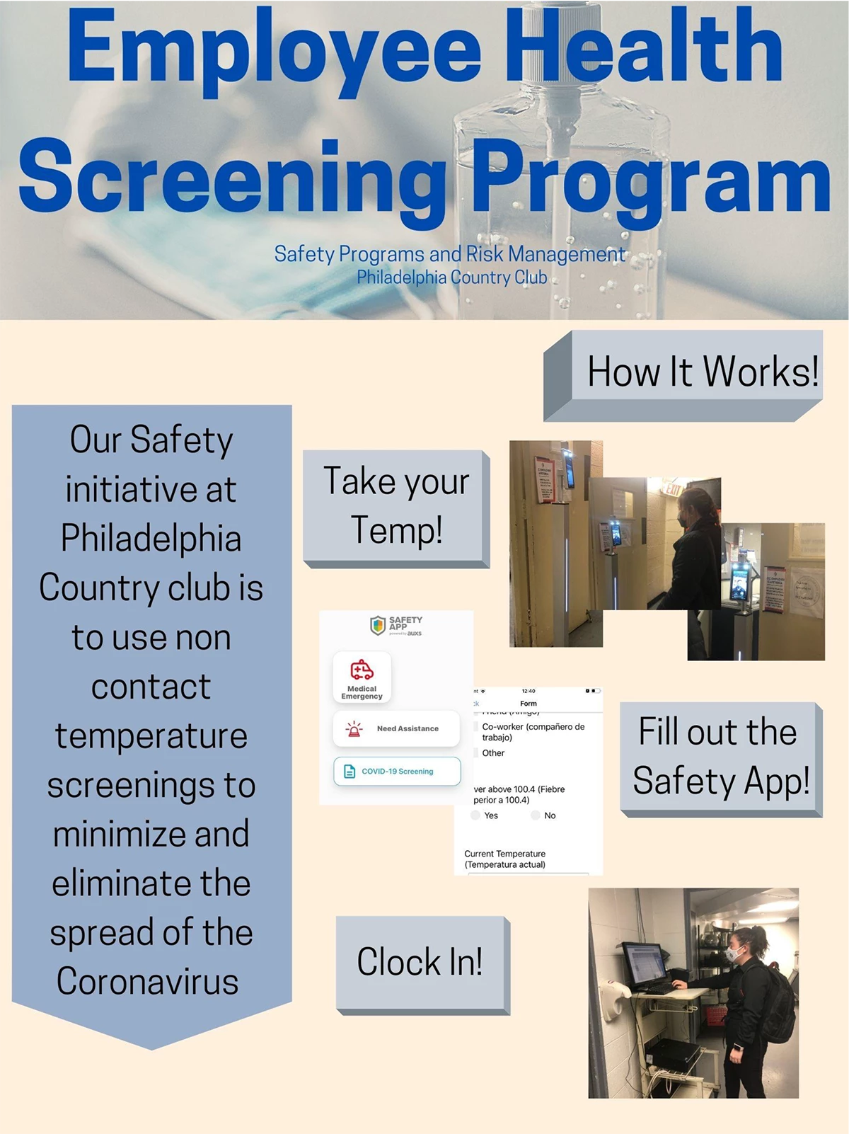 As we planned to open the club we knew that in order to keep both staff and members safe there needed to be a screening program implemented. When it first started we had a member of staff manually taking temps of each staff member that came in to the building. After a few months of the pandemic new technology started to come out and the temp stations were available for us to streamline the process. After implementing the new technology both staff and members felt safer that all employees are required to screen their symptoms and check that they are able to be around our members.