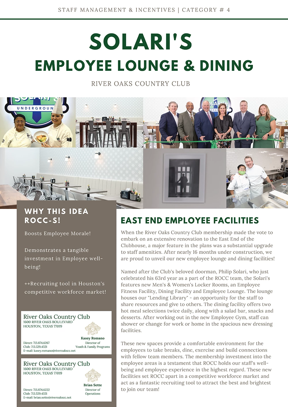 As part of the Club's recent construction project, ROCC built a new wing centered entirely around employee amenities. The opening of the Solaris Employee Areas has certainly boosted employee morale. It has demonstrated a tangible investment by the membership in employee well-being. The facilities also set us apart, and serve as a valuable recruitment tool in a competitive workforce market.