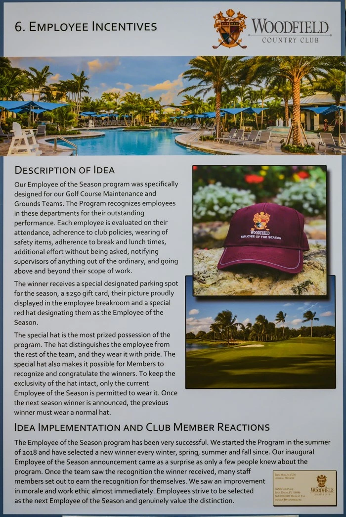 Our Employee of the Season program was specifically designed for our Golf Course Maintenance and Grounds Teams. The Program recognizes employees in these departments for their outstanding performance. Each employee is evaluated on their attendance, adherence to club policies, wearing of safety items, adherence to break and lunch times, additional effort without being asked, notifying supervisors of anything out of the ordinary, and going above and beyond their scope of work.