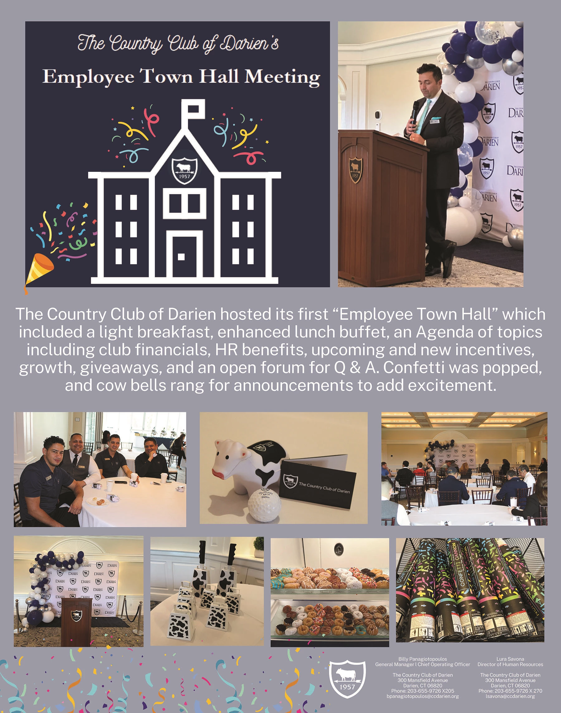 The Country Club of Darien hosted its first “Employee Town Hall” which included a light breakfast, enhanced lunch buffet, an Agenda of topics including club financials, HR benefits, upcoming and new incentives, growth, giveaways, and an open forum for Q & A. Confetti was popped, and cow bells rang for announcements to add excitement.