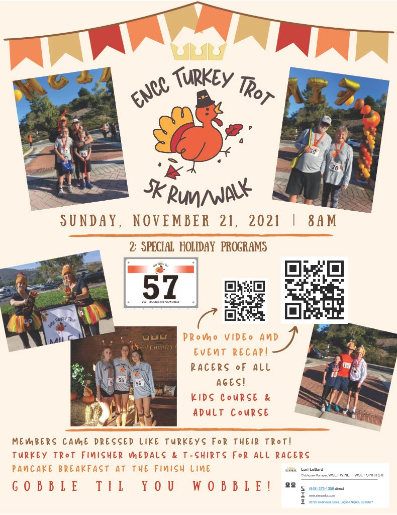 Our First Annual Turkey Trot brought members of all ages (20 days old -81 years old) together as we ran through the local community! We had signs posted on trails per our city permit stating trail share. People in the community were talking about how great ENCC is to do this for our members! We were infectious! Brand building at its best!