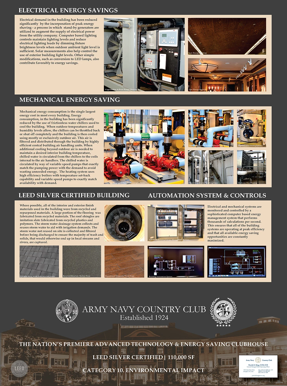 The Arlington, VA campus of Army Navy Country Club provides its membership a clubhouse that is extremely energy efficient with the lowest possible operating expenses. The mechanical and electrical systems are environmentally responsible and sustainable. This board demonstrates the means and methods used to achieve these standards and goals.