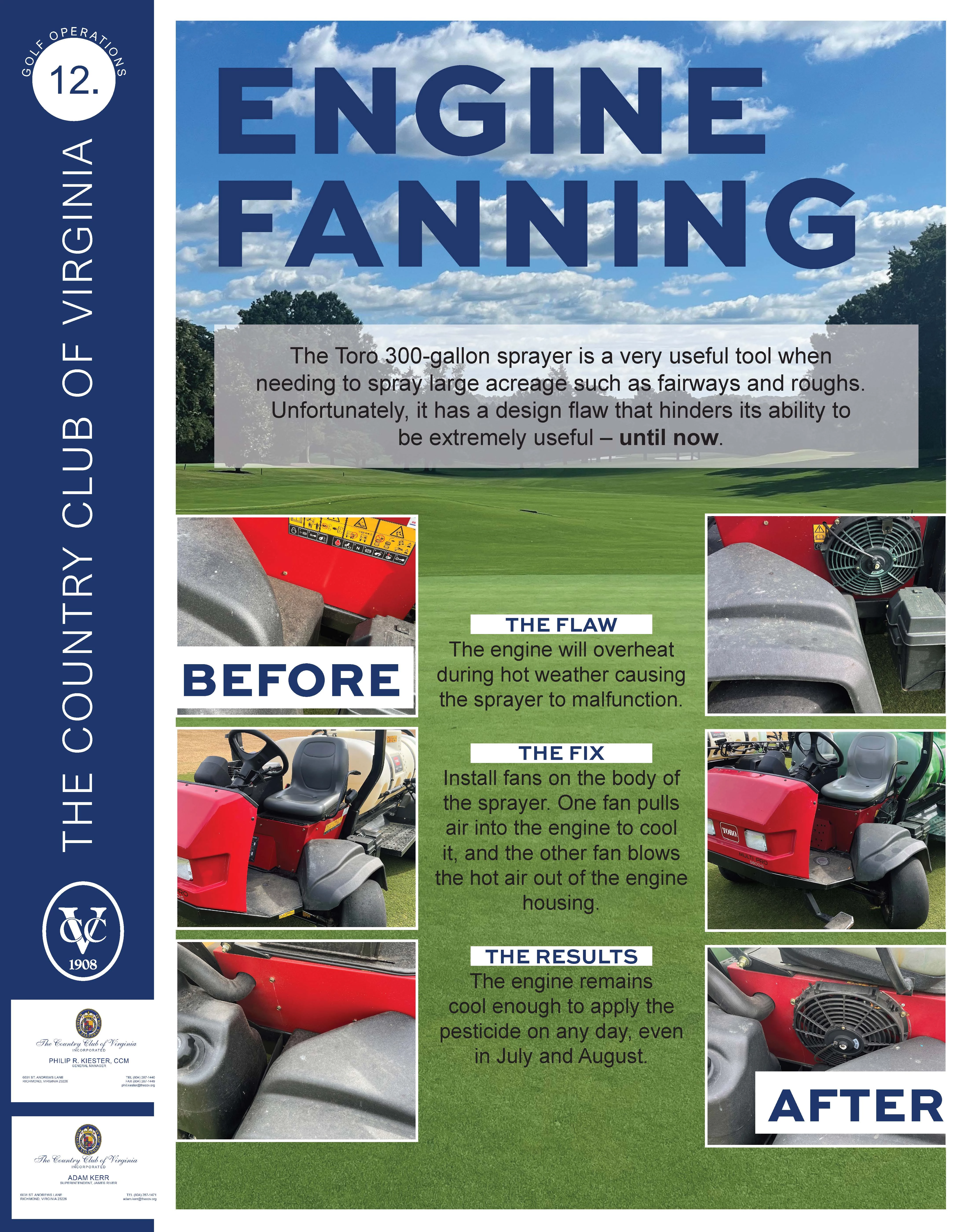 The Toro 300-gallon sprayer is a very useful tool in Golf Maintenance when needing to spray large acreage such as fairways and roughs. Unfortunately, it has a design flaw that hinders its ability to be extremely useful – until now. The flaw is that the engine will overheat during hot weather, causing the sprayer to stop spraying – and in extreme situations – shut completely off. We created a solution to fix the problem: installing fans on the body of the sprayer on each side of the engine. One fan pulls air into the engine to cool it, and the other fan blows the hot air out of the engine housing. This has resulted in keeping the engine cool enough to apply the pesticide on any day, even in July and August.