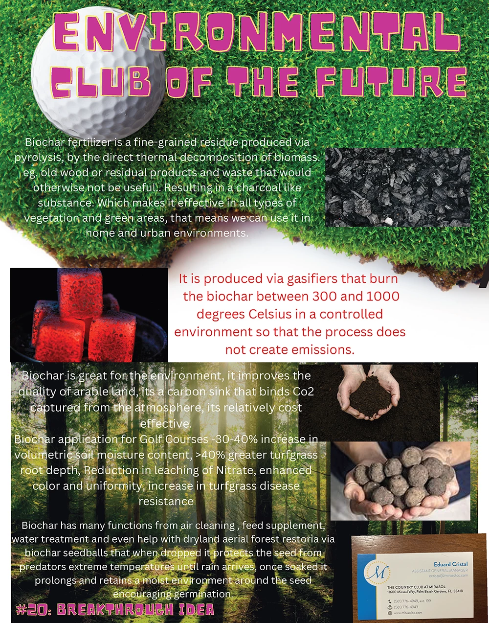 Biochar application for Golf Courses -30-40% increase in volumetric soil moisture content, >40% greater turfgrass root depth, Reduction in leaching of Nitrate, enhanced color, and uniformity, increase in turfgrass disease resistance.
