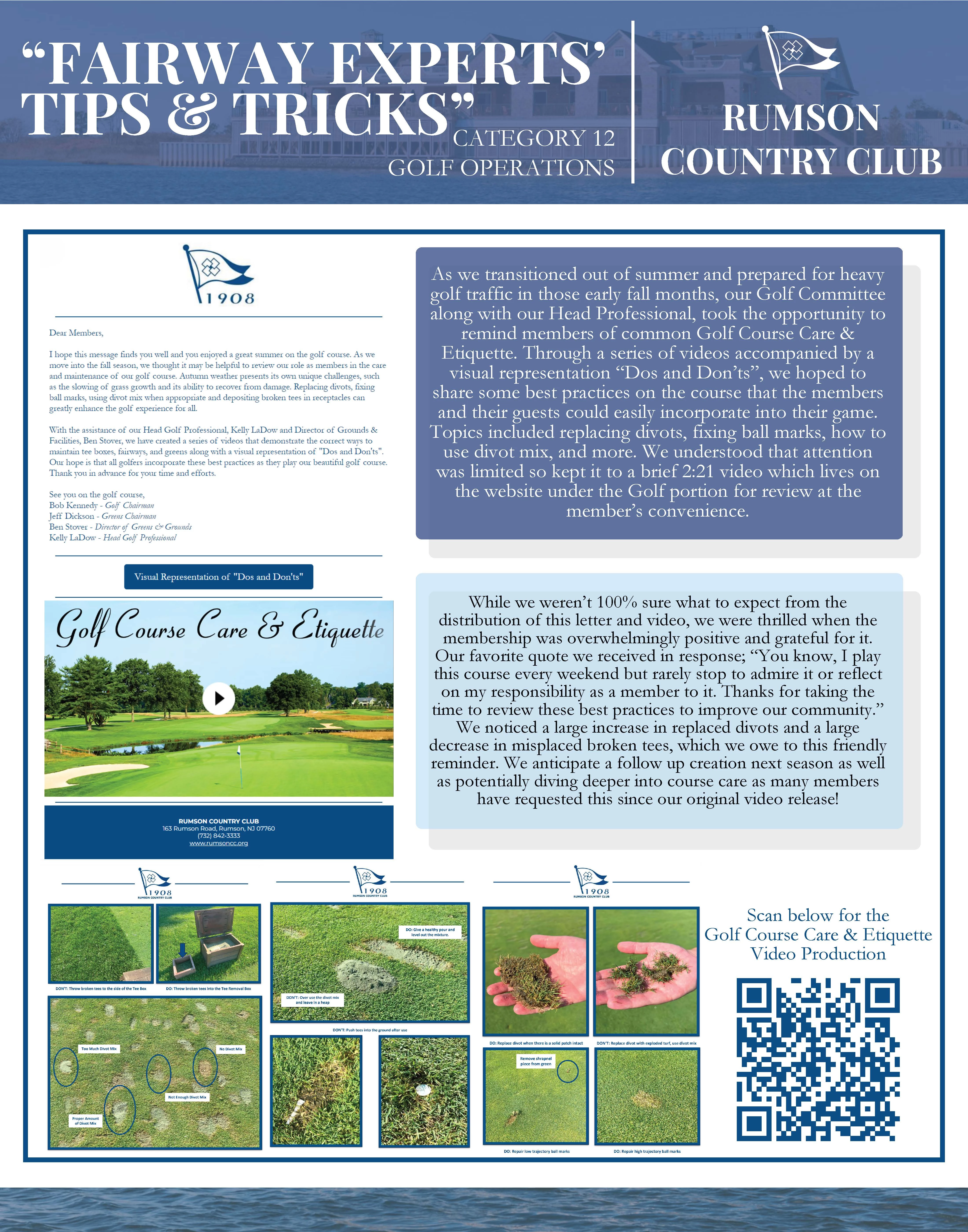 As we transitioned out of summer and prepared for heavy golf traffic in those early fall months, our Golf Committee along with our Head Professional, took the opportunity to remind members of common Golf Course Care & Etiquette. Through a series of videos accompanied by a visual representation “Dos and Don’ts”, we hoped to share some best practices on the course that the members and their guests could easily incorporate into their game. Topics included replacing divots, fixing ball marks, how to use divot mix, and more. We understood that attention was limited so kept it to a brief 2:21 video which lives on the website under the Golf portion for review at the member’s convenience.