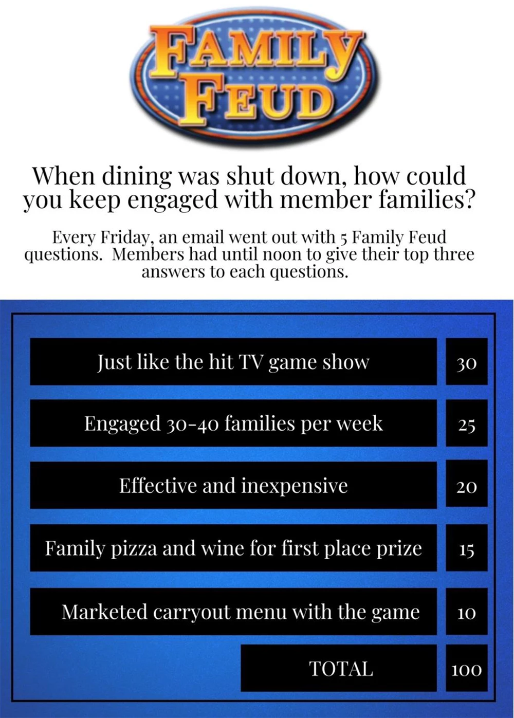 Membership Director thought we needed to stay connected with all members during shut down no in dining service no holiday events ie.. cookie decorating / Santa Brunch so we found Family Feud online questions for families to compete. On average 30-40 families responded in competition for family meal deal. It was a great competition that truly engaged members.