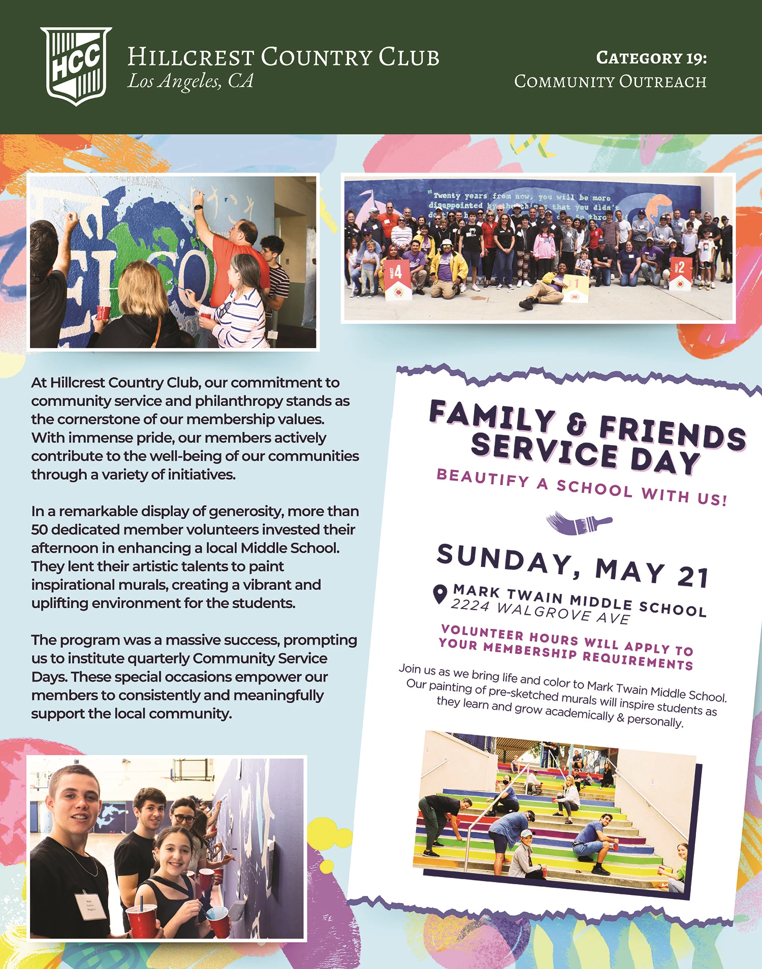 At Hillcrest Country Club, our commitment to community service and philanthropy stands as the cornerstone of our membership values. With immense pride, our members actively contribute to the well-being of our communities through a variety of initiatives. In a remarkable display of generosity, more than 50 dedicated member volunteers invested their afternoon in enhancing a local Middle School. They lent their artistic talents to paint inspirational murals, creating a vibrant and uplifting environment for the students. The program was a massive success, prompting us to institute quarterly Community Service Days. These special occasions empower our members to consistently and meaningfully support the local community.