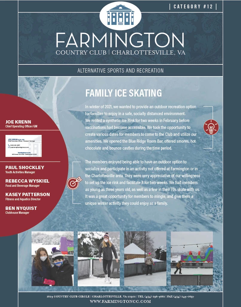The members enjoyed being able to have an outdoor option to socialize and participate in an activity not offered at Farmington or in the Charlottesville area. They were very appreciative of our willingness to set up the ice rink and facilitate it for two weeks. We had members as young as three years old, as well as a few in their 70s skate with us. It was a great opportunity for members to mingle, and give them a unique winter activity they could enjoy as a family.