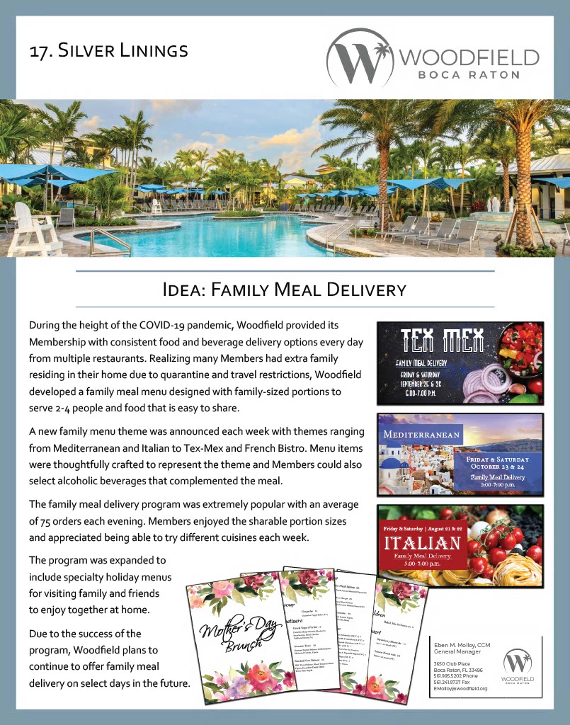 During the height of the COVID-19 pandemic, Woodfield provided its Membership with consistent food and beverage delivery options every day from multiple restaurants. Realizing many Members had extra family residing in their home due to quarantine and travel restrictions, Woodfield developed a family meal menu designed with family-sized portions to serve 2-4 people and food that is easy to share.