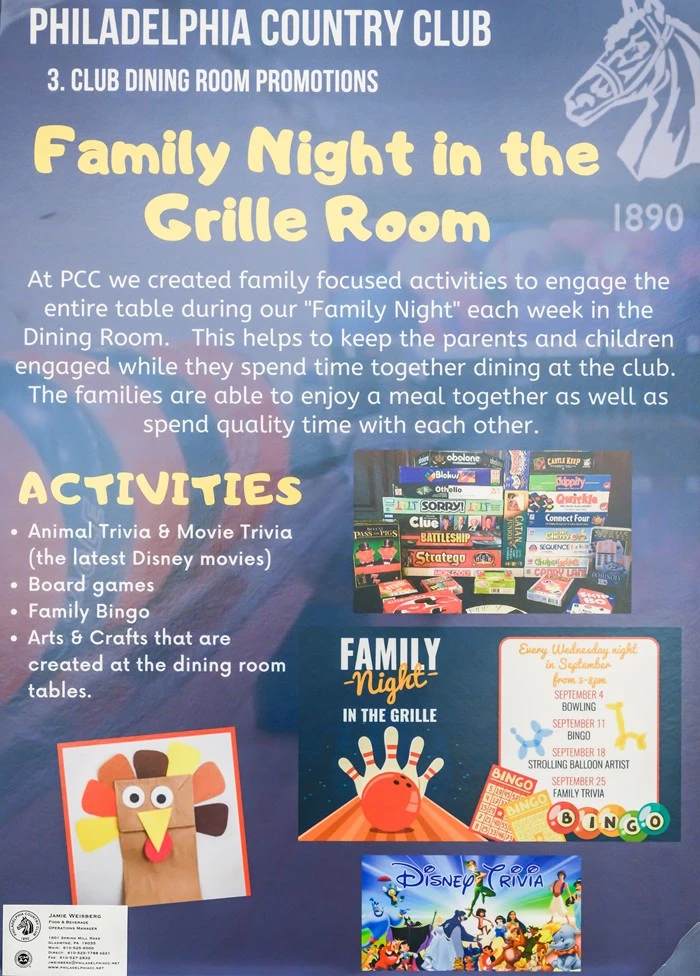 Our idea is to be able to host families in the middle of the week that are able to enjoy dinner together but to also spend quality time with each other as well. We offer activities during the evening in the grille room that allow parents and children to be engaged such as, trivia games (Disney movies, animal trivia), board games, Bingo and small crafts. This has helped us to keep family night focused on the families spending time together and supports our family focused culture.