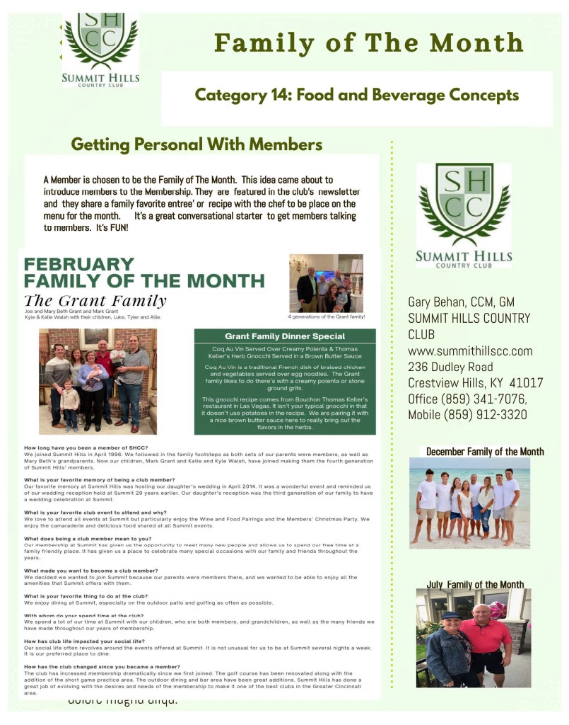 This idea of featuring a family of the month enhanced our club over the year tremendous. Whoever the Family of the Month was each month was excited to come to dinner and they talked about their menu special, the staff also enjoyed talking it up. The featured family would bring guest out and talked to their friends about coming out to try their special meal. It really helped in our slow months get more people to the dining room. It was also nice to get to know the members who we highlighted each month and other members get to know them. Our Chef also took a lot out of it meeting with them and getting their family receipts and even doing tasting for a few of them to make sure we had their menu exactly right.