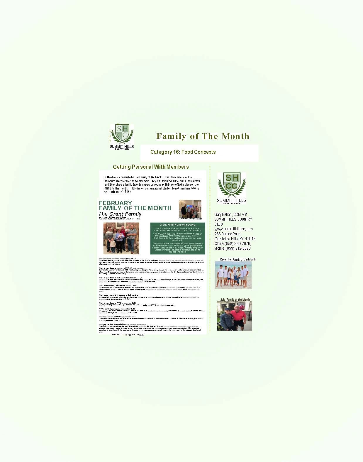 The idea came from what we themed the year at the Club which was “The Year of the Family”. We wanted to feature a family event each month like Magic Night, Silly Safari, Mother Daughter Princess Brunch etc. and then we came up with the idea to feature a family of the month is our monthly newsletter for 11 months (we are closed in January). How we went about picking the families was first we looked at who had multiple generations of members and the first Family the Grant family was four generations Mr. Grant Senior is a member his son Joe and his wife are members Mrs. Grants parents were members and the Grants two children Katie and Mark are also members so that was our first criteria. Then we looked at how long some of the members where here and we emailed that group and asked them if they wanted to be featured in the monthly newsletter and we had 100% excepted as they all felt like it was a special honor to be picked. What we asked each member to do was get with our Executive Chef to plan the meal they would have at home with their own recipe, and we would duplicate it for the month as our Family of the Month special. We also asked each member to fill out I list of nine questions and send us a picture of their family for the Newsletter the following were the questions asked.