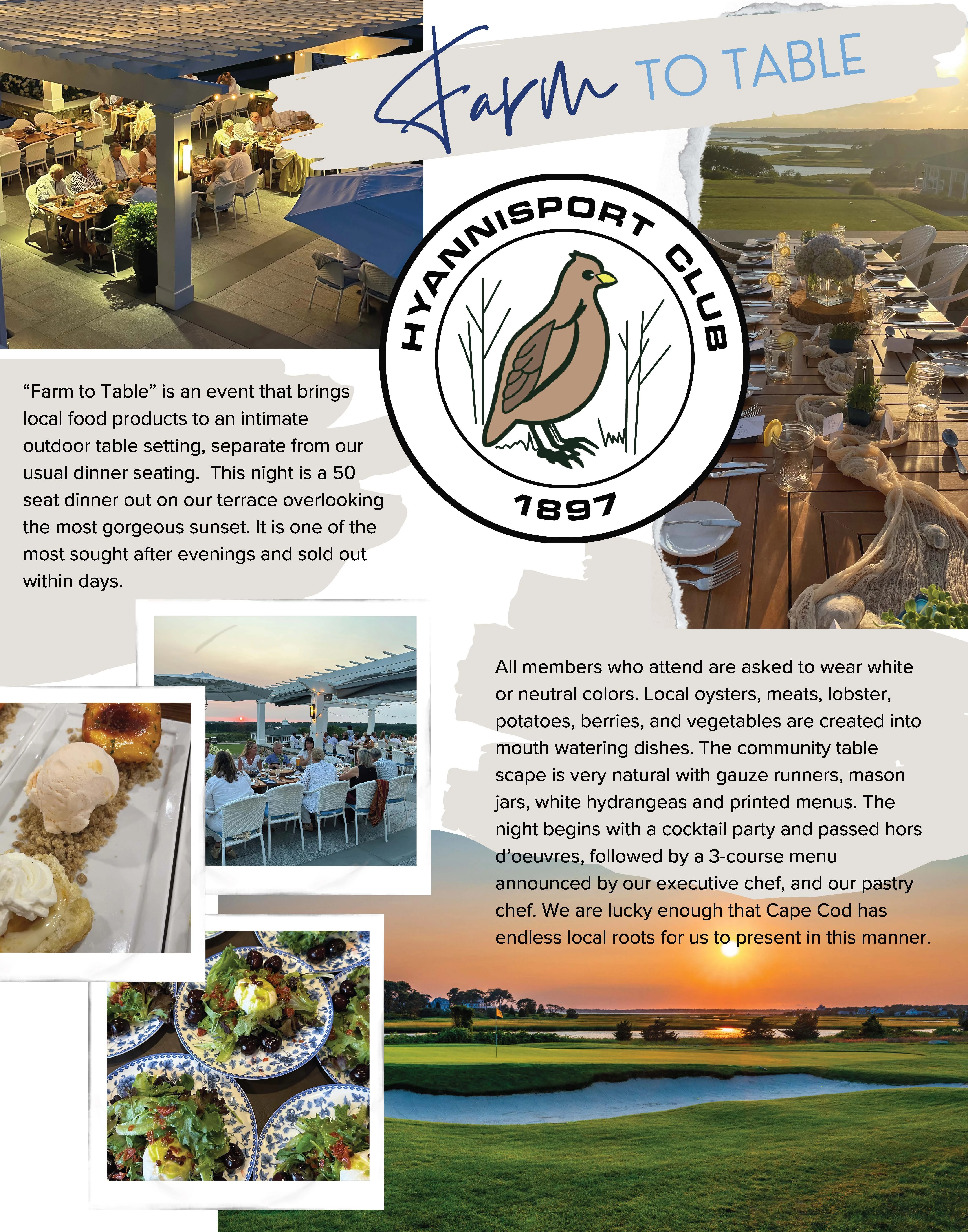 All members who attend are asked to wear white or neutral colors. Local oysters, meats, lobster, potatoes, berries, and vegetables are created into mouth watering dishes. The community table scape is very natural with gauze runners, mason jars, white hydrangeas and printed menus. The night begins with a cocktail party and passed hors d’oeuvres, followed by a 3-course menu announced by our executive chef, and our pastry chef. We are lucky enough that Cape Cod has endless local roots for us to present in this manner.