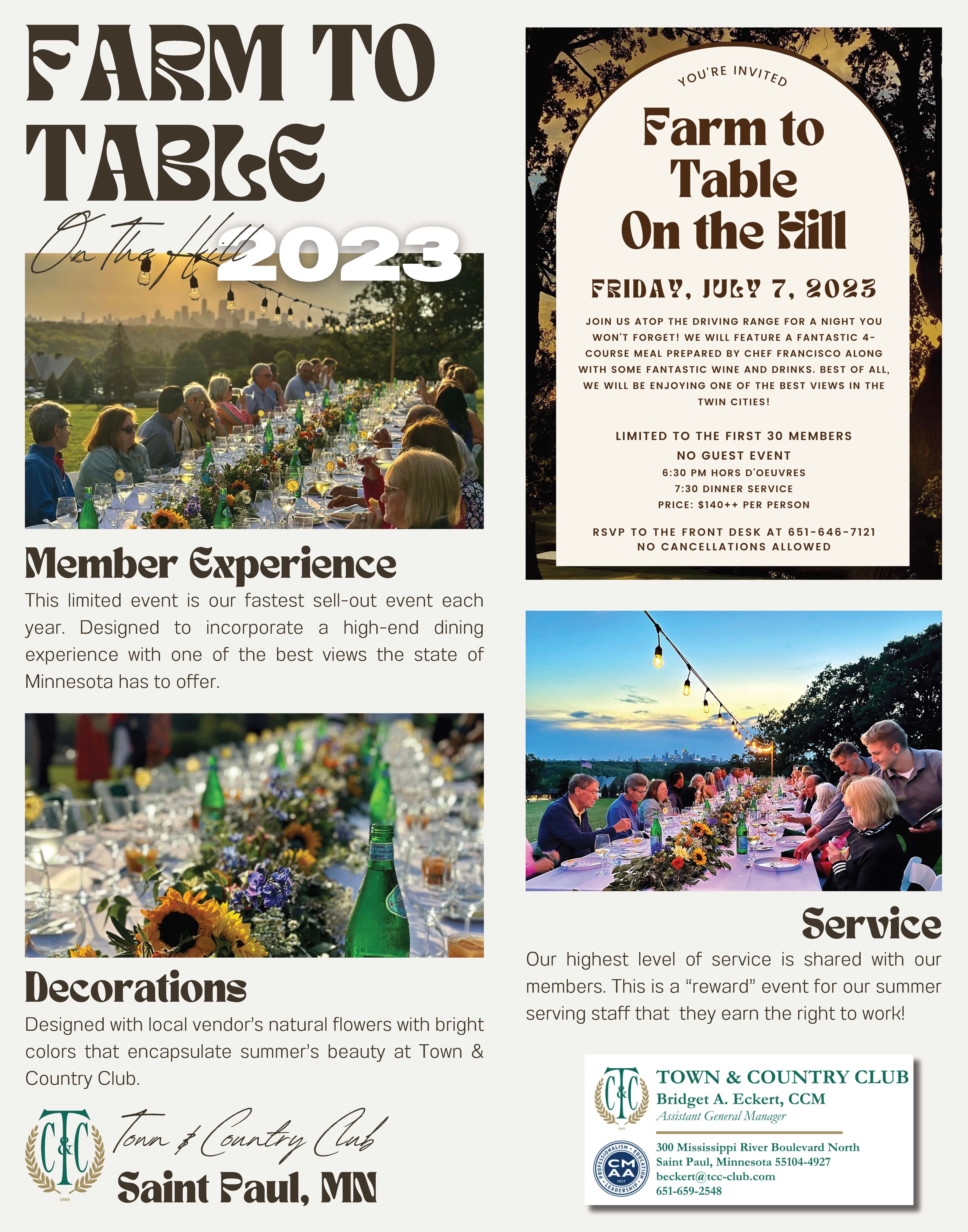 This is an annual event at the highest elevation on the golf course, overlooking the Mississippi River and Downtown Minneapolis. We provide an intimate wine dinner in the open air, taking advantage of views that cannot be seen from the Member Dining spaces in the Clubhouse. This event is only possible with the support of both the Grounds Crew and the Golf Operations Team to get not only Members and staff up to the top of the hill, but also all the equipment needed to execute this event. It's truly a collaboration and only a few members per year get to have this experience with us.
