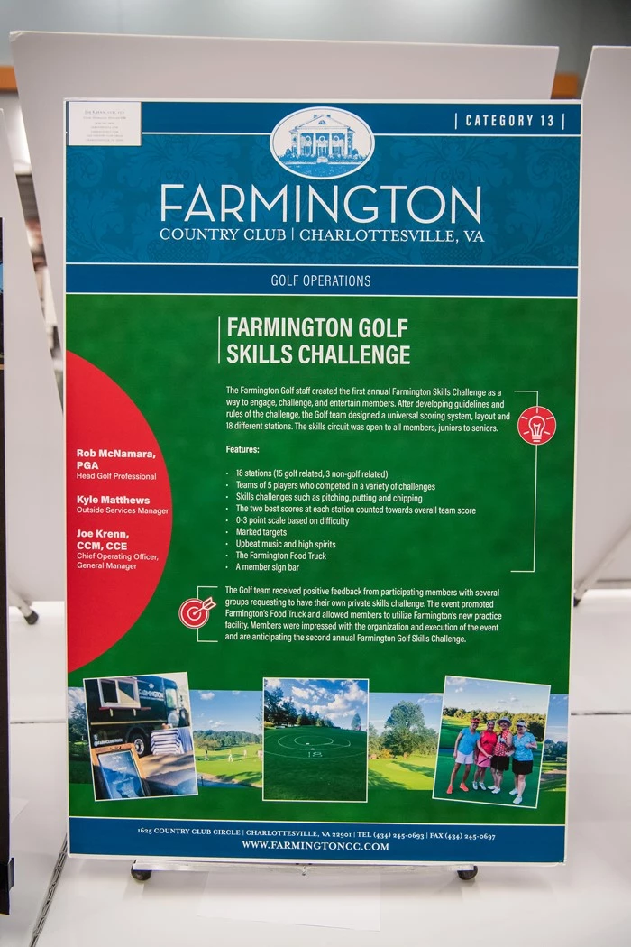 Features included: 18 Stations (15 golf related, 3 non-golf related); teams of 5 players who competed in a variety of challenges; skills challenges such as pitching, putting and chipping; the two best scores at each station counted towards overall team score; 0-3 point scale based on difficulty; marked targets; upbeat music and high spirits; the Farmington Food Truck; a member sign bar.