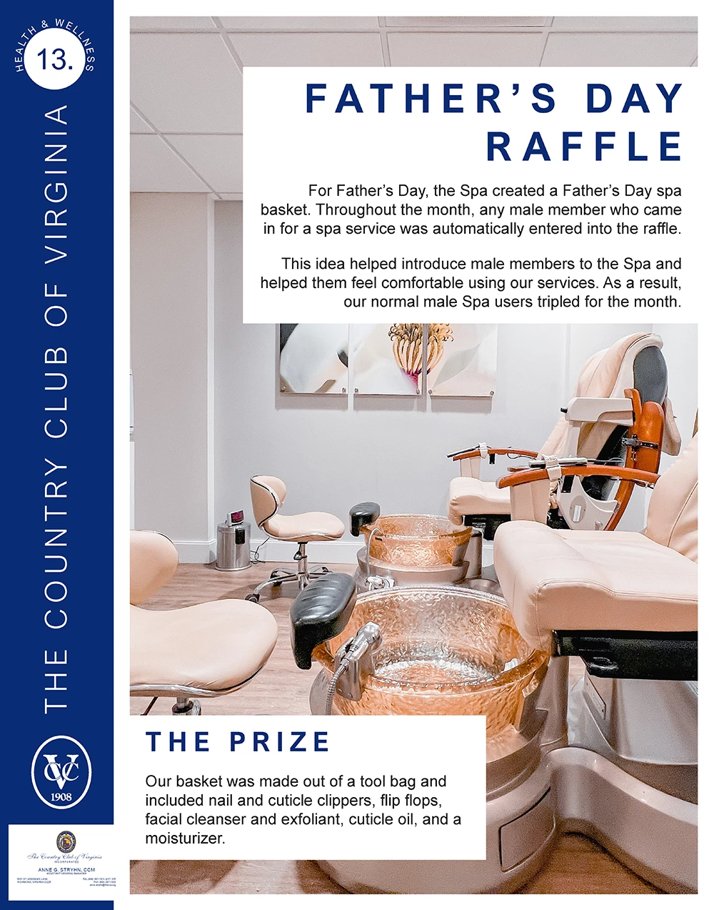Idea Description: For Father’s Day, the Spa created a Father’s Day spa basket. Throughout the month, any male member who came in for a spa service was automatically entered into the raffle.