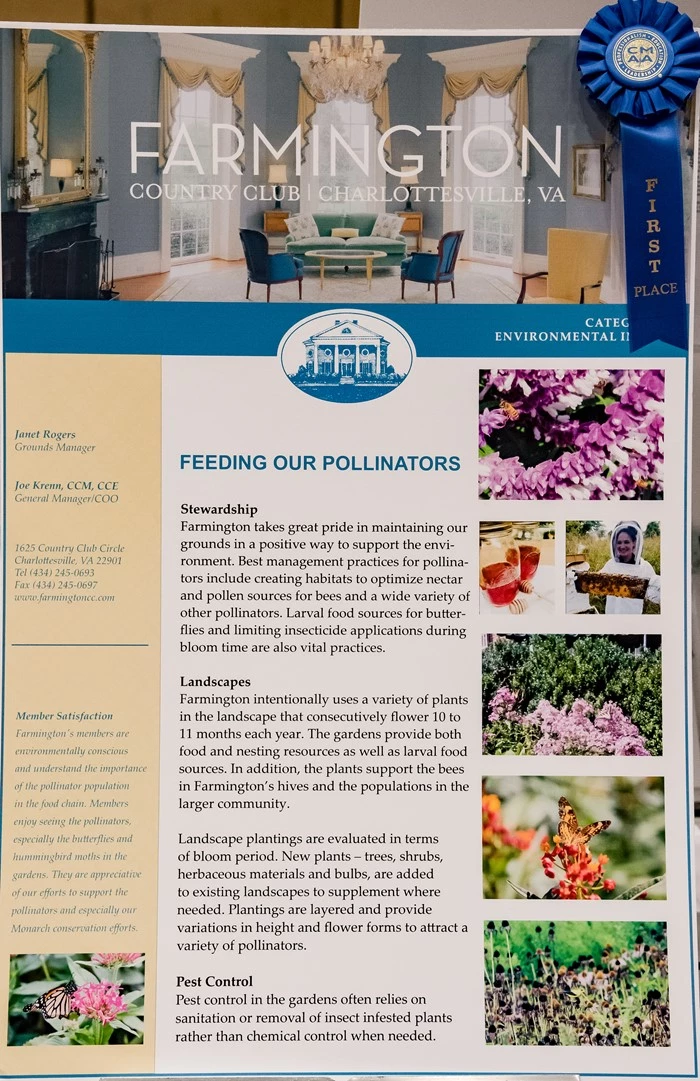 Farmington takes great pride in maintaining our grounds in a positive way to support the environment. Best management practices for pollinators include creating habitats to optimize nectar and pollen sources for bees and a wide variety of other pollinators. Larval food sources for butterflies and limiting insecticide applications during bloom time are also vital practices.