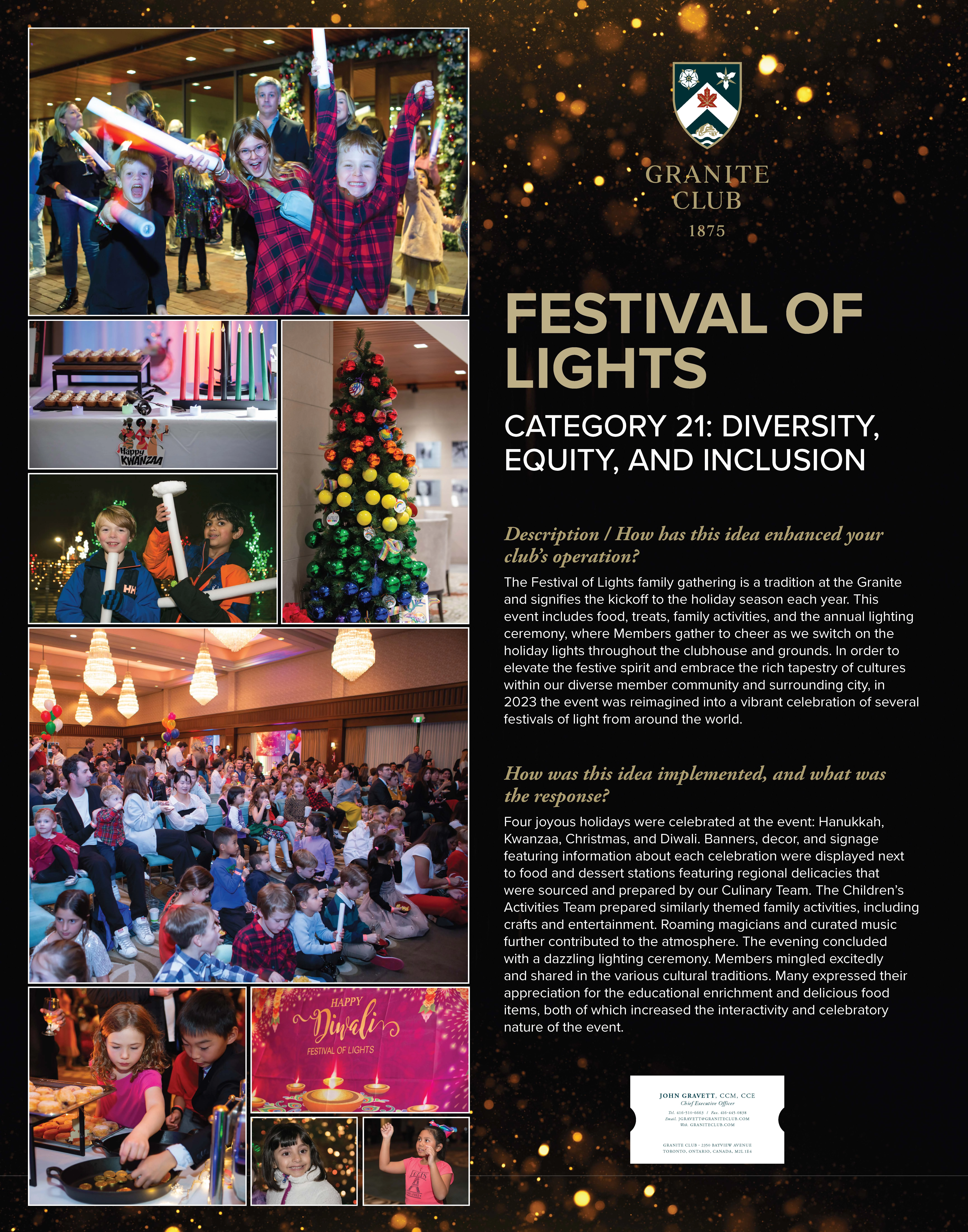 The Festival of Lights family gathering is a tradition at the Granite and signifies the kickoff to the holiday season each year. This event includes food, treats, family activities, and the annual lighting ceremony, where Members gather to cheer as we switch on the holiday lights throughout the clubhouse and grounds. In order to elevate the festive spirit and embrace the rich tapestry of cultures within our diverse member community and surrounding city, in 2023 the event was reimagined into a vibrant celebration of several festivals of light from around the world.